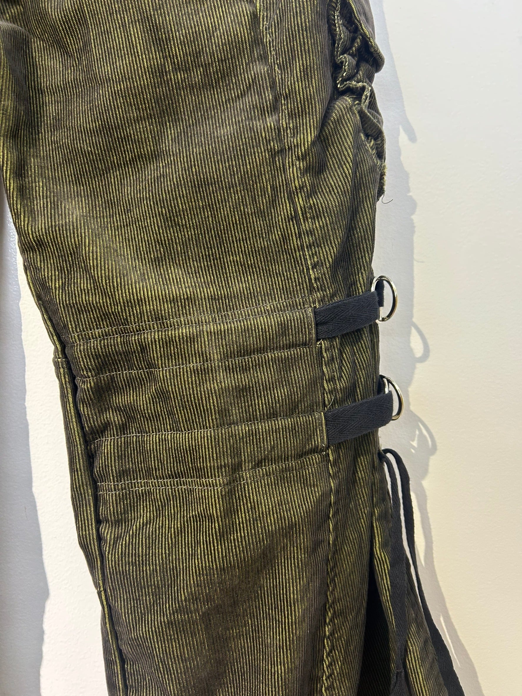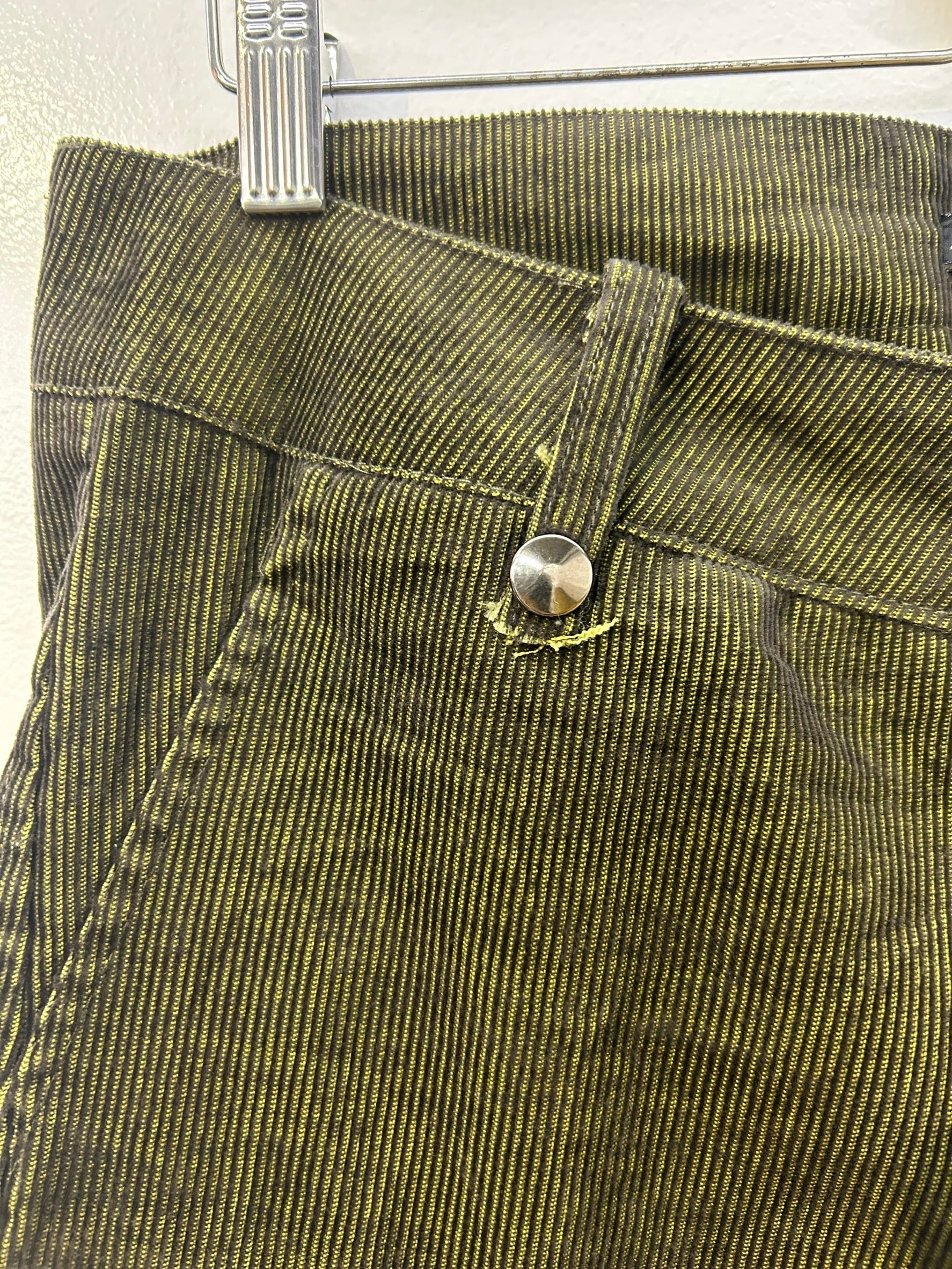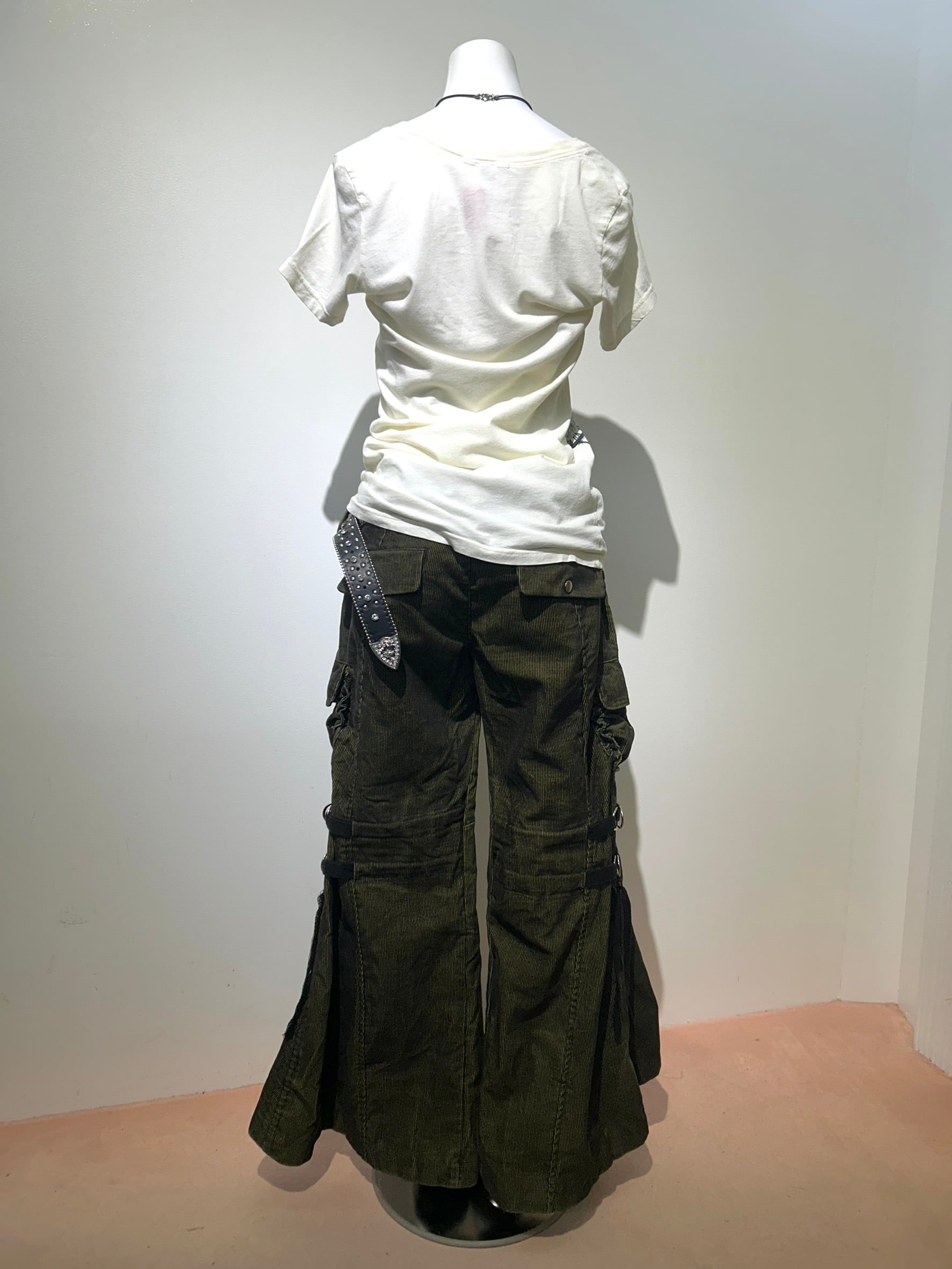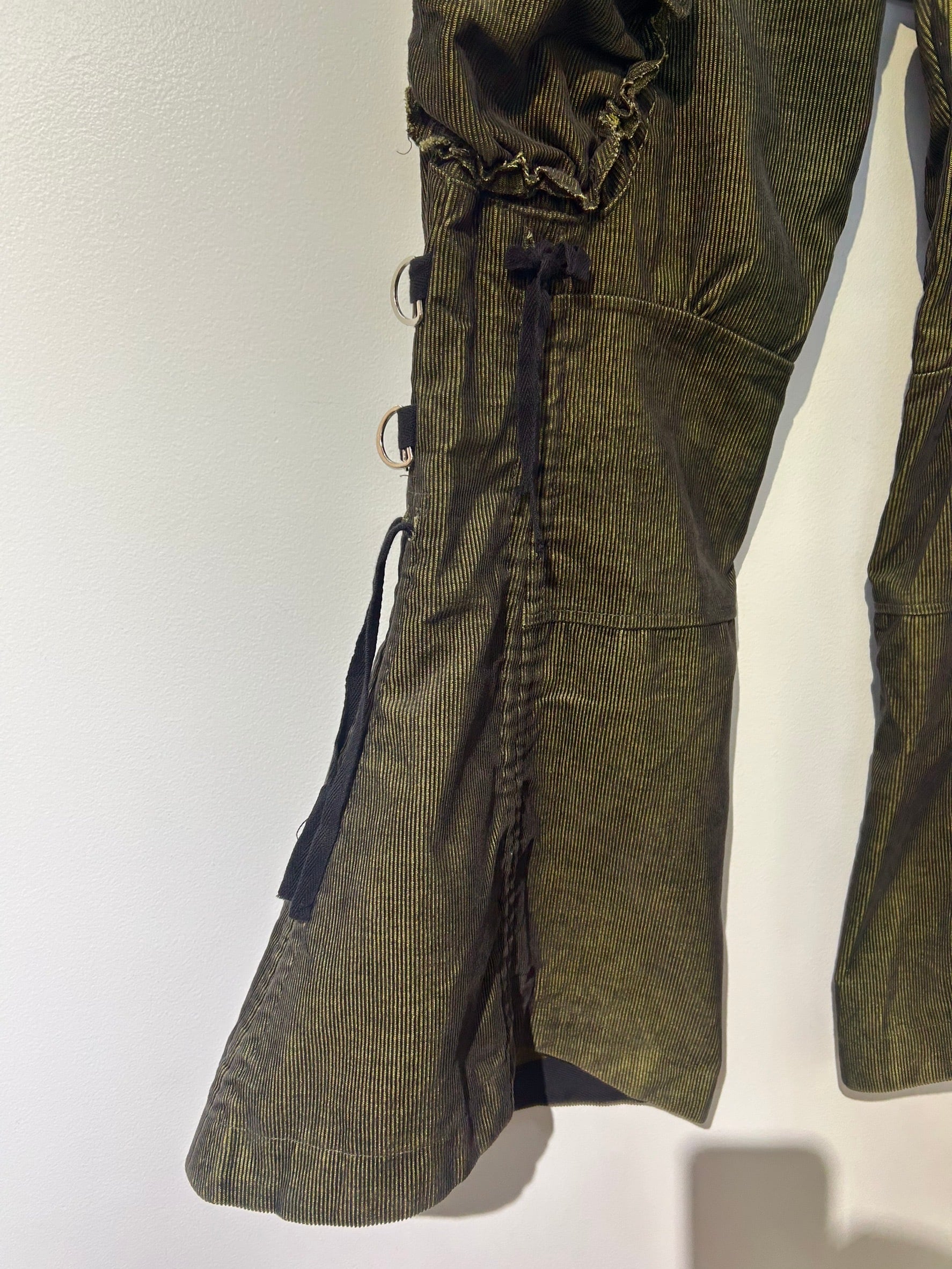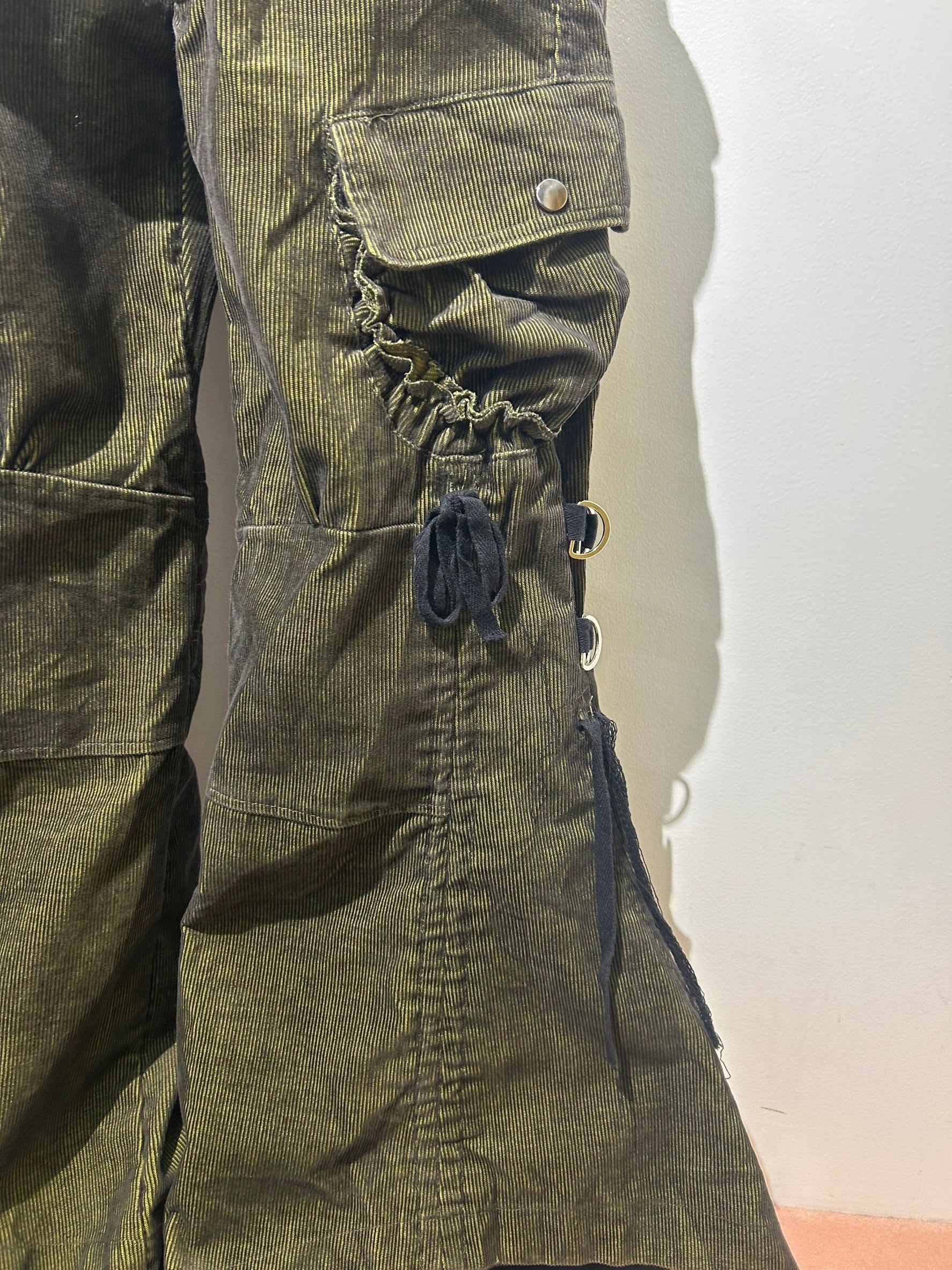 素材: 65%Cotton 35%Polyester サイズ: M(表記)ウエスト幅43cm ヒップ幅50cm 股上20cm 股下72cm ワタリ幅30cm 裾幅44cm ダメージ: 写真18枚目の生地のダメージ、19枚目の紐のダメージがあります