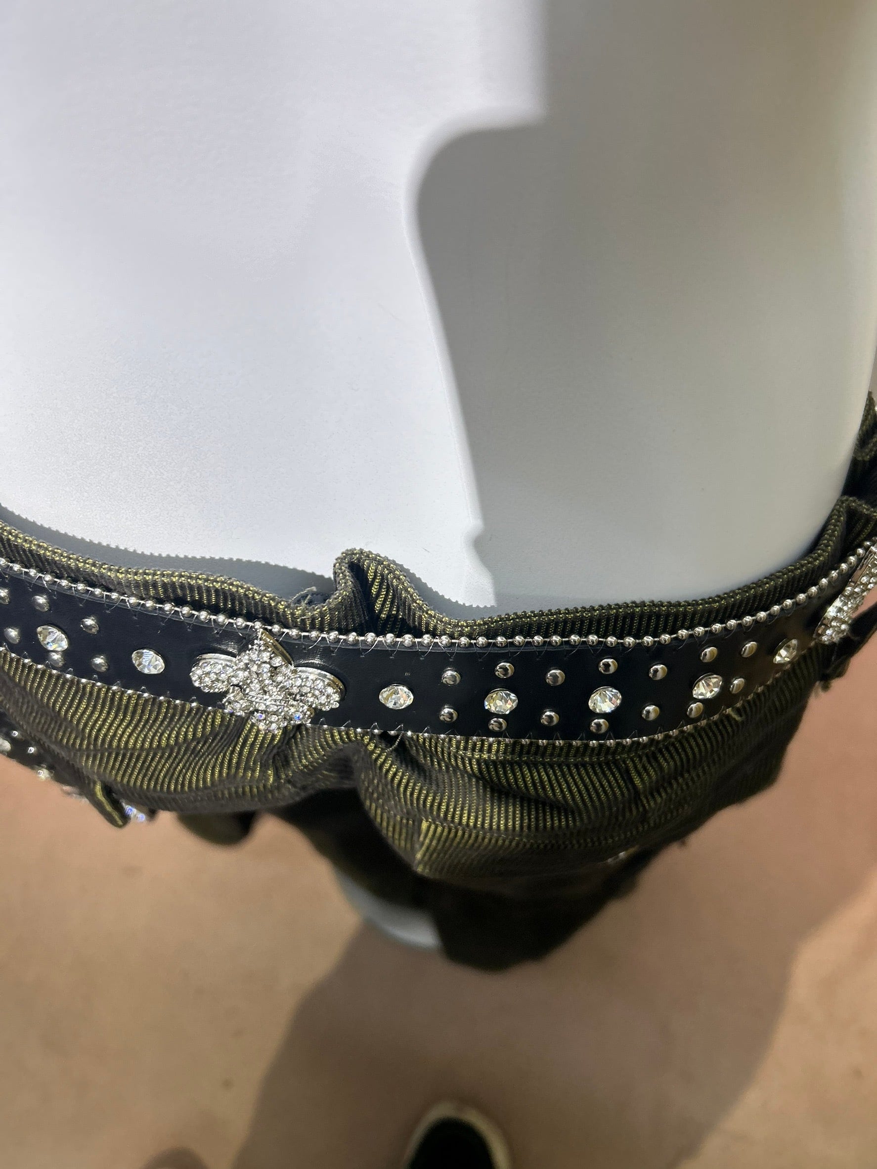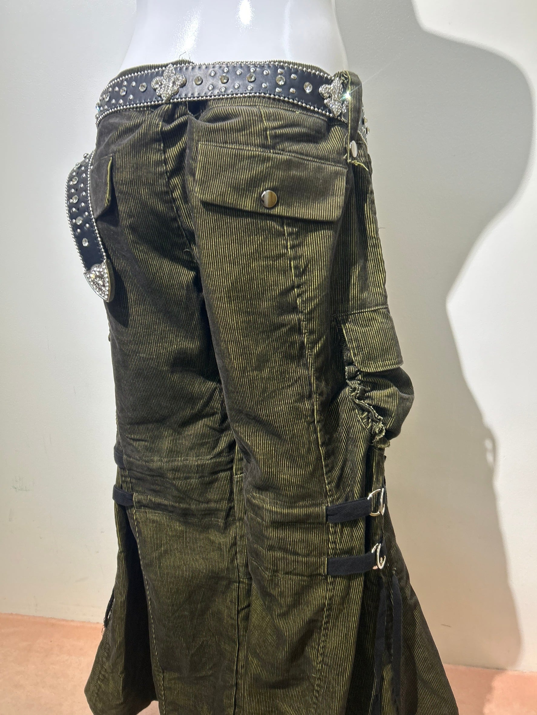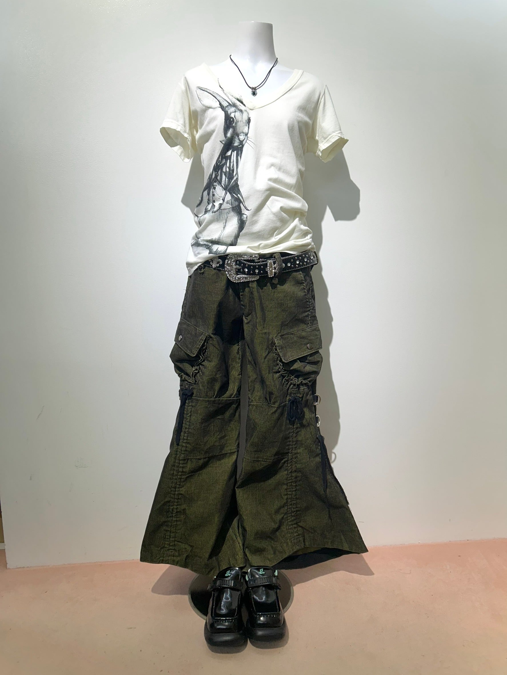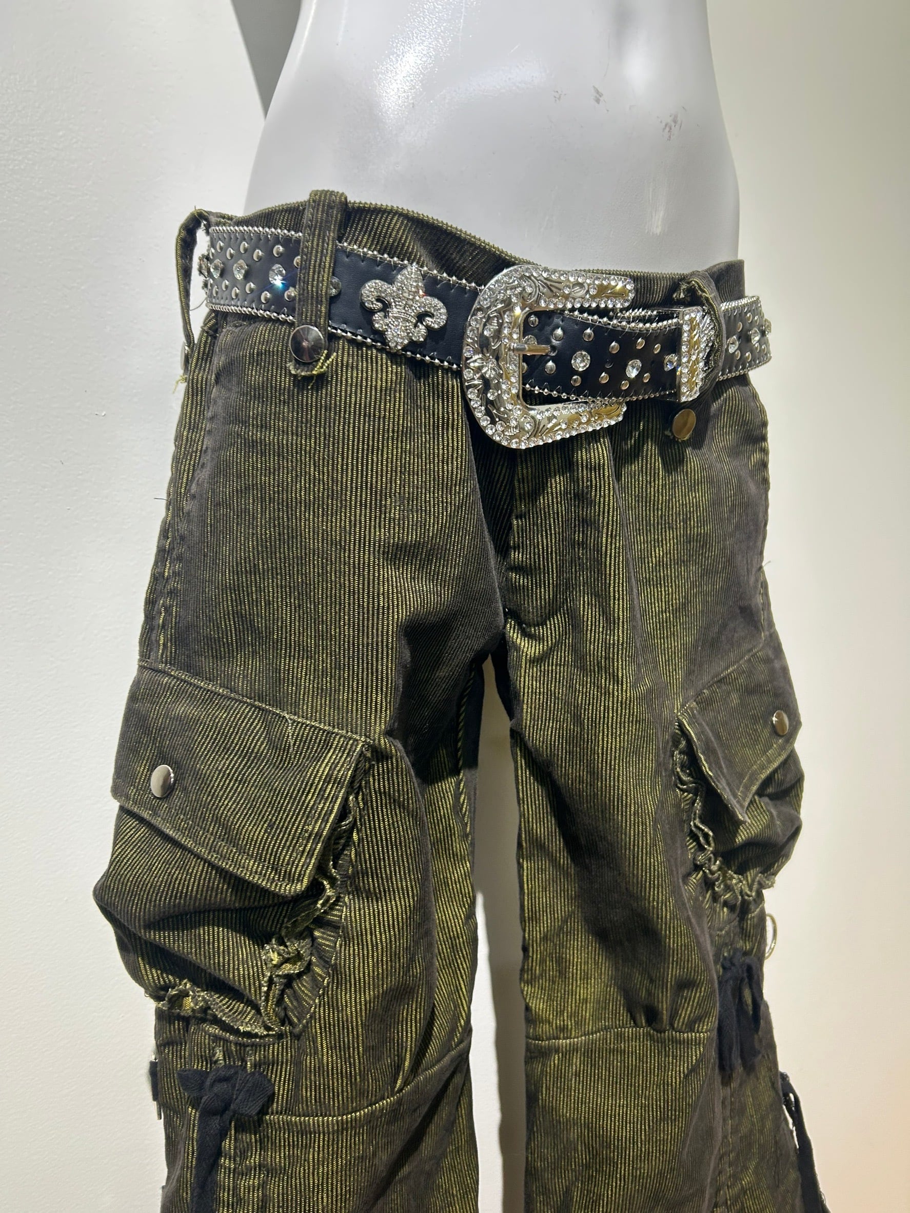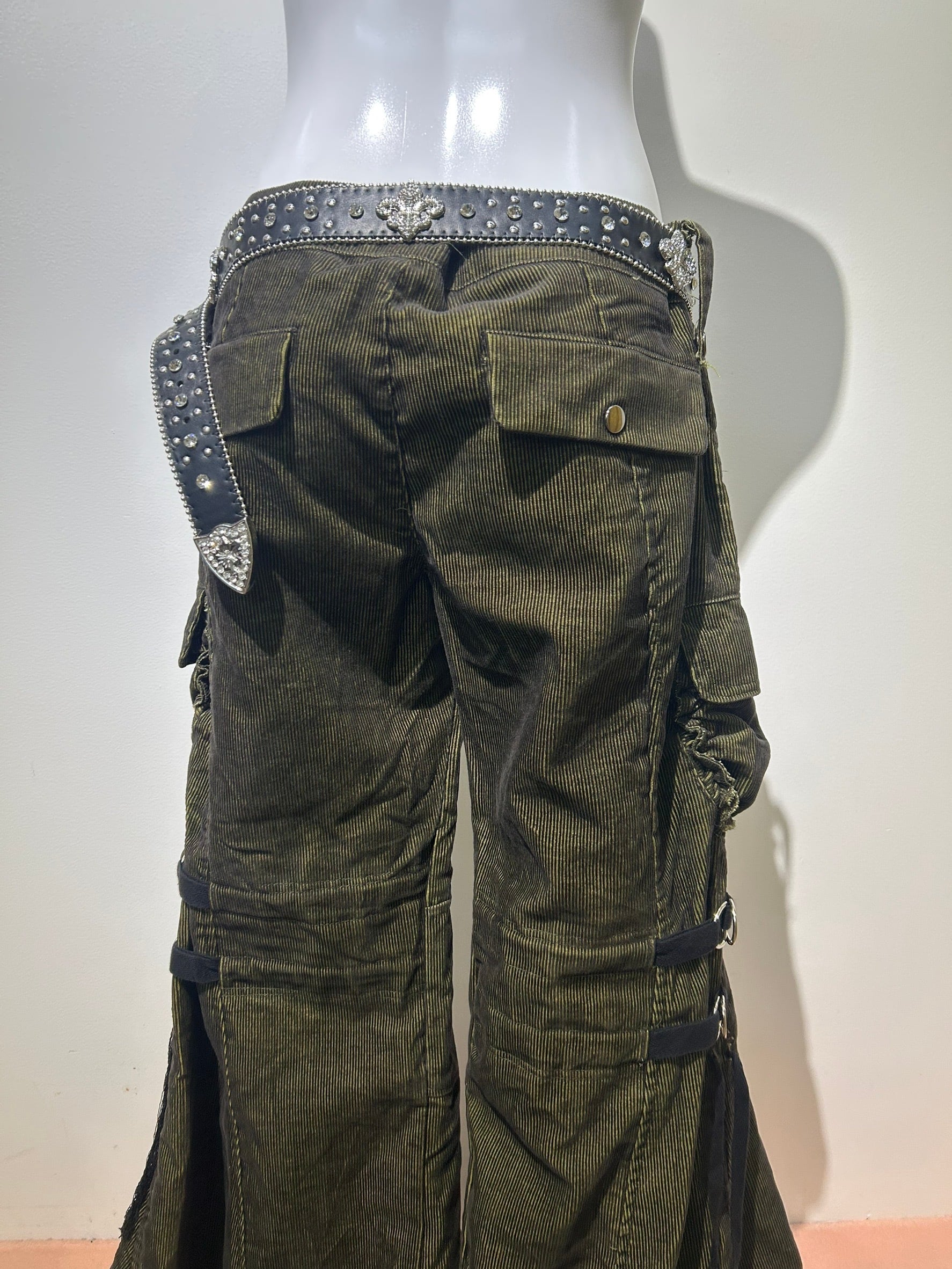 素材: 65%Cotton 35%Polyester サイズ: M(表記)ウエスト幅43cm ヒップ幅50cm 股上20cm 股下72cm ワタリ幅30cm 裾幅44cm ダメージ: 写真18枚目の生地のダメージ、19枚目の紐のダメージがあります