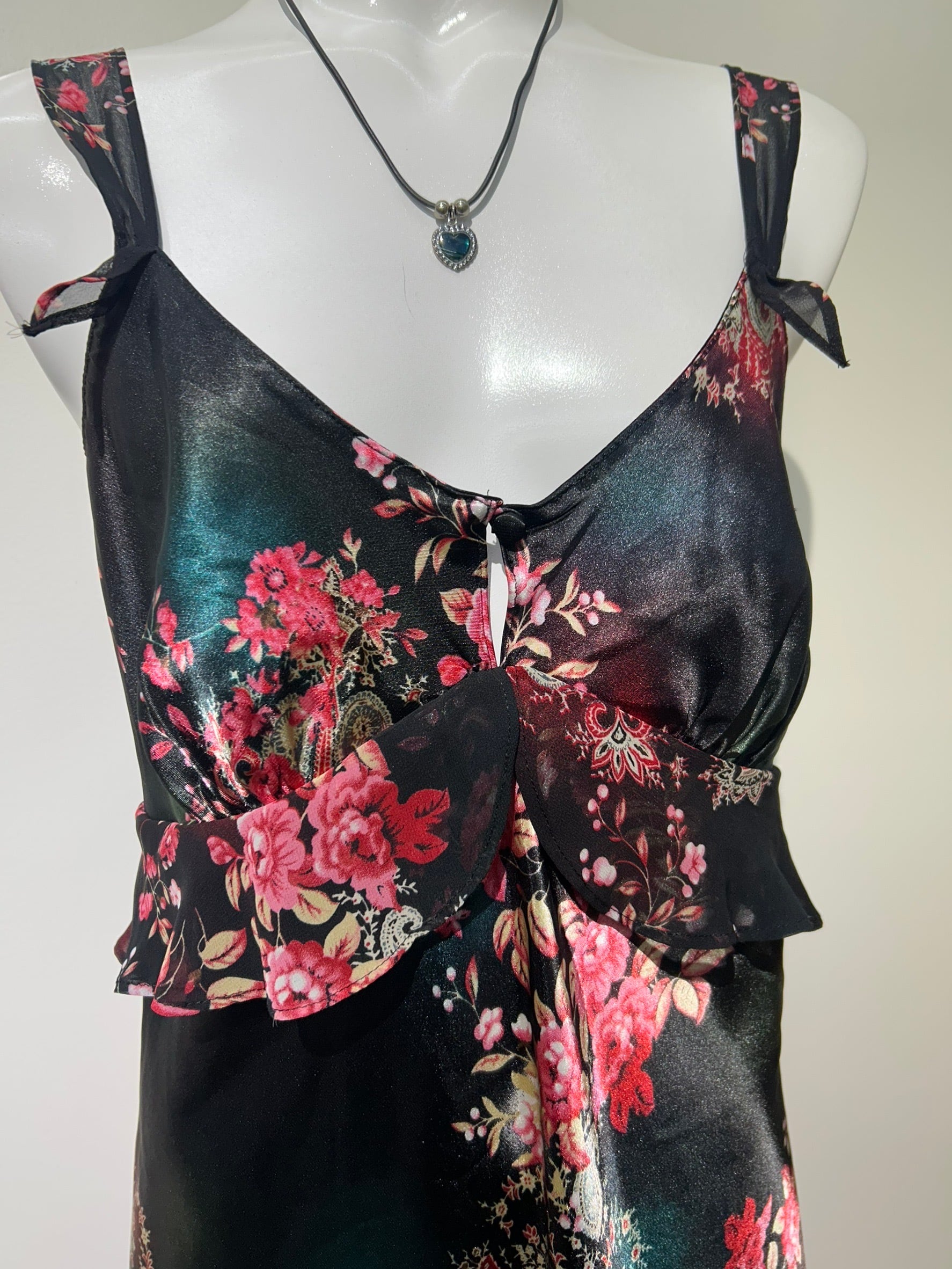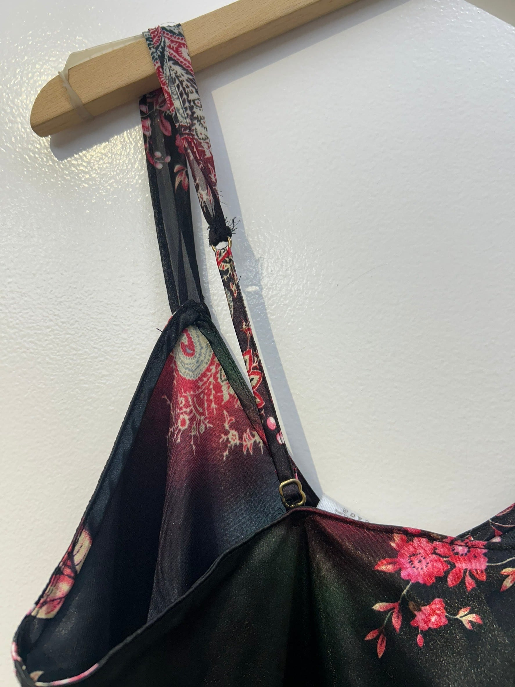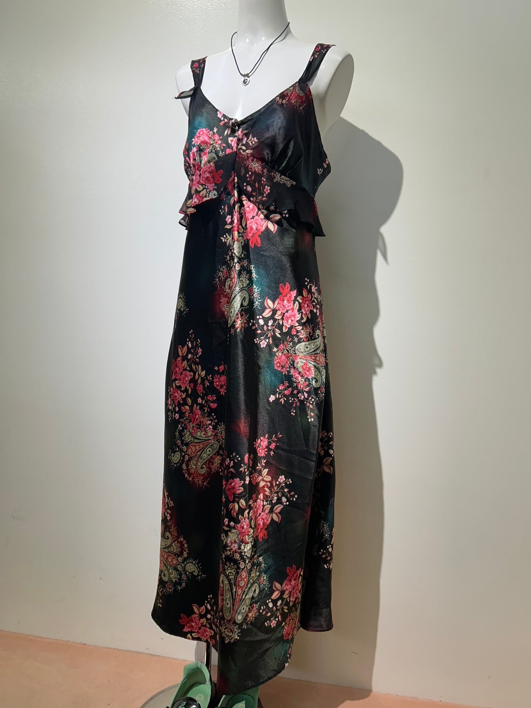 素材: 100%Polyester サイズ: S(表記) 前身頃109cm 後ろ身頃95cm 身幅39cm 肩紐38〜45cm ダメージ: 写真20枚目のお直しがあります