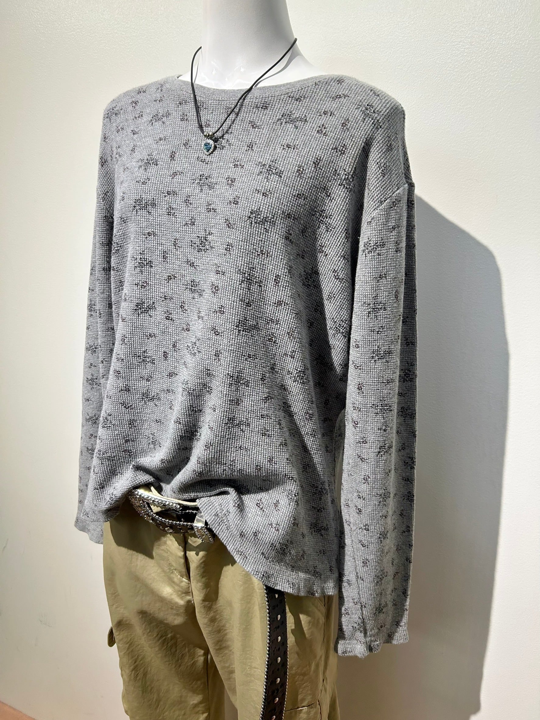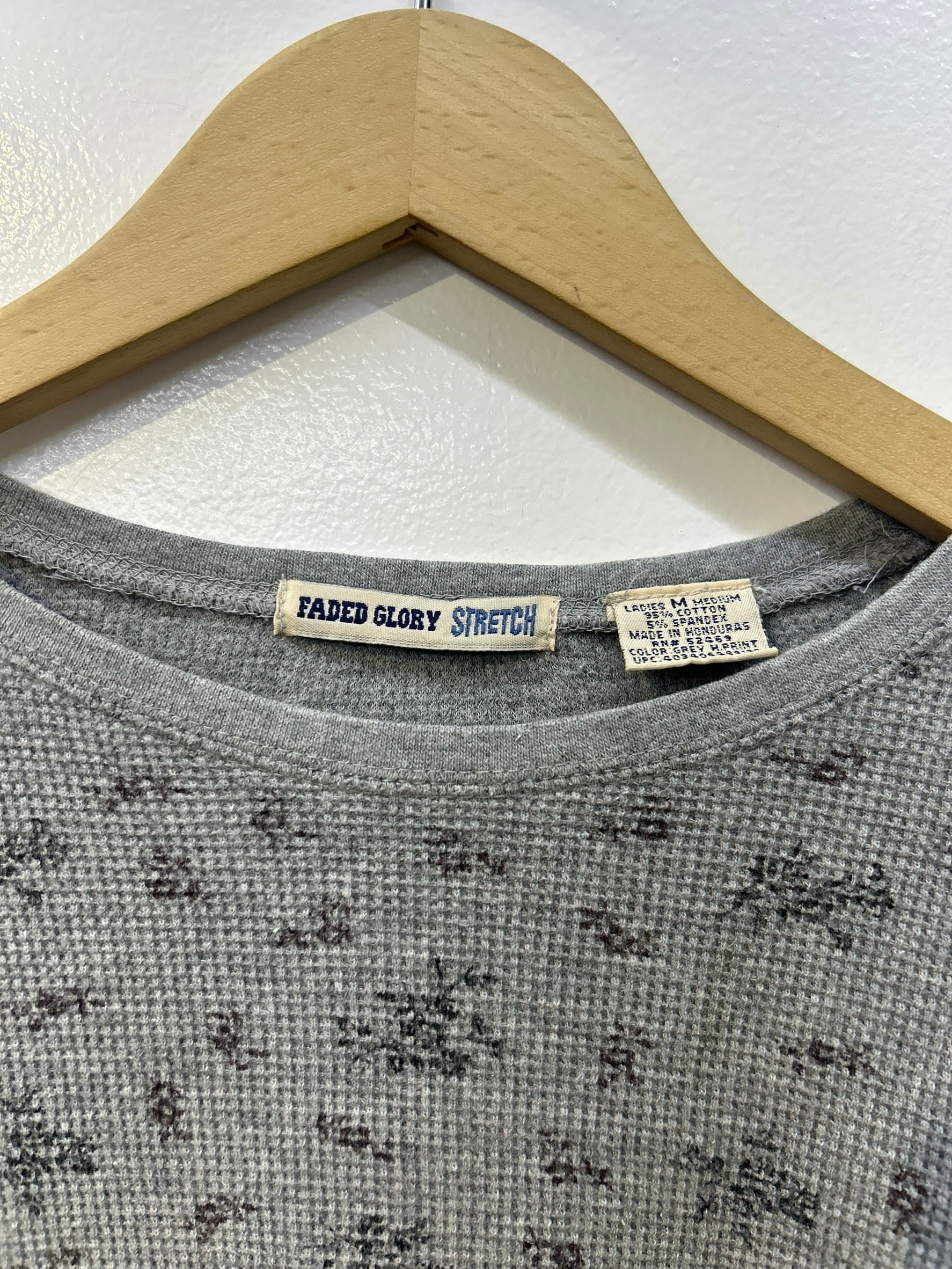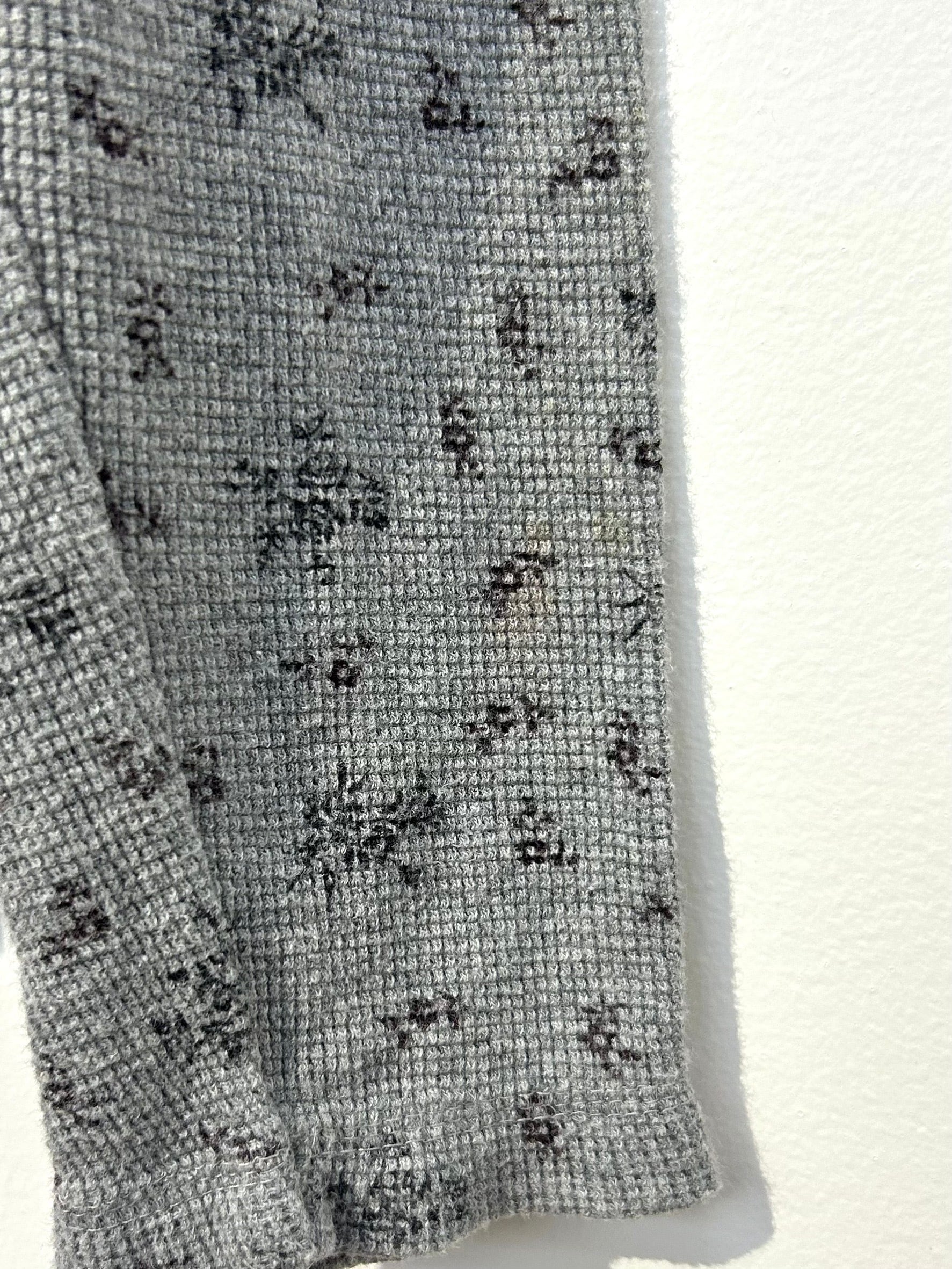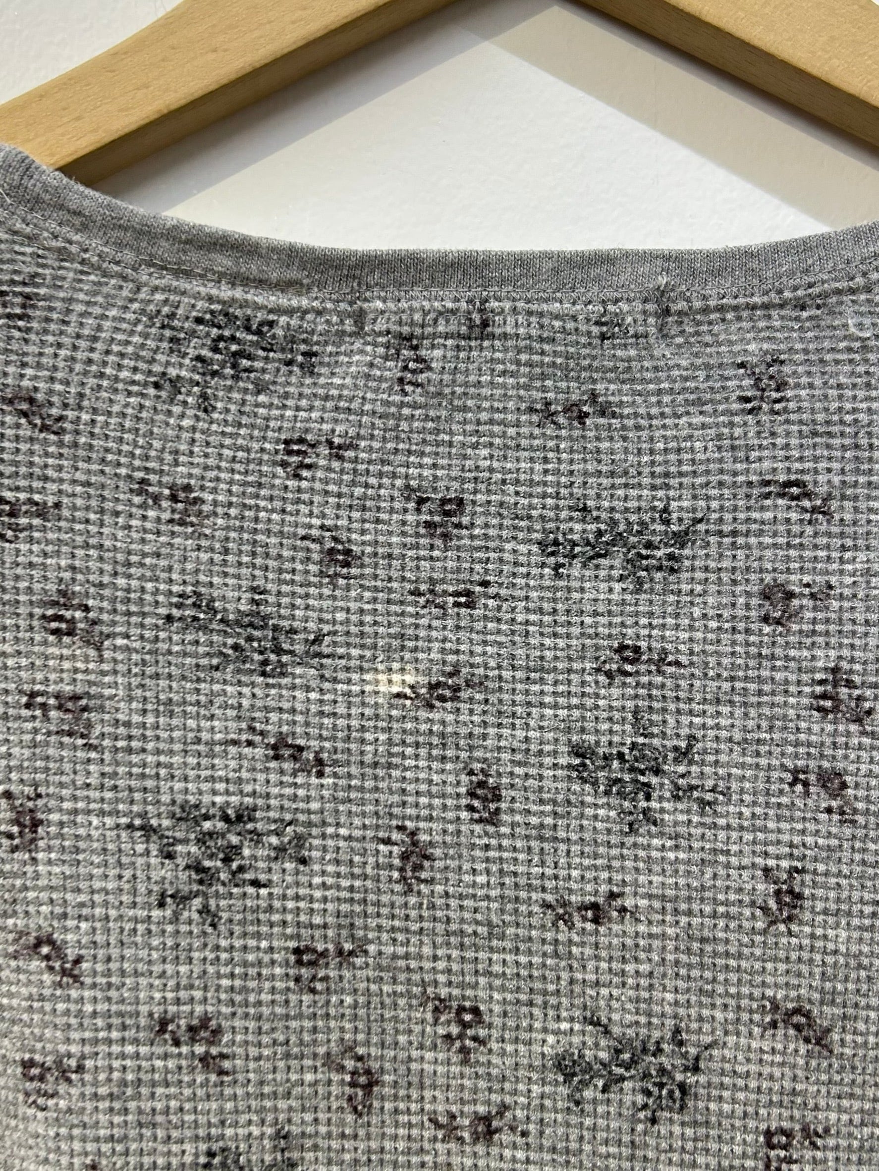 素材: 95%Cotton 5%Spandex サイズ: M(表記) 着丈55cm 肩幅49cm 身幅52cm 袖丈56cm ダメージ: 写真12枚目の糸のほつれ、13枚目の汚れ、14枚目の色落ちがあります