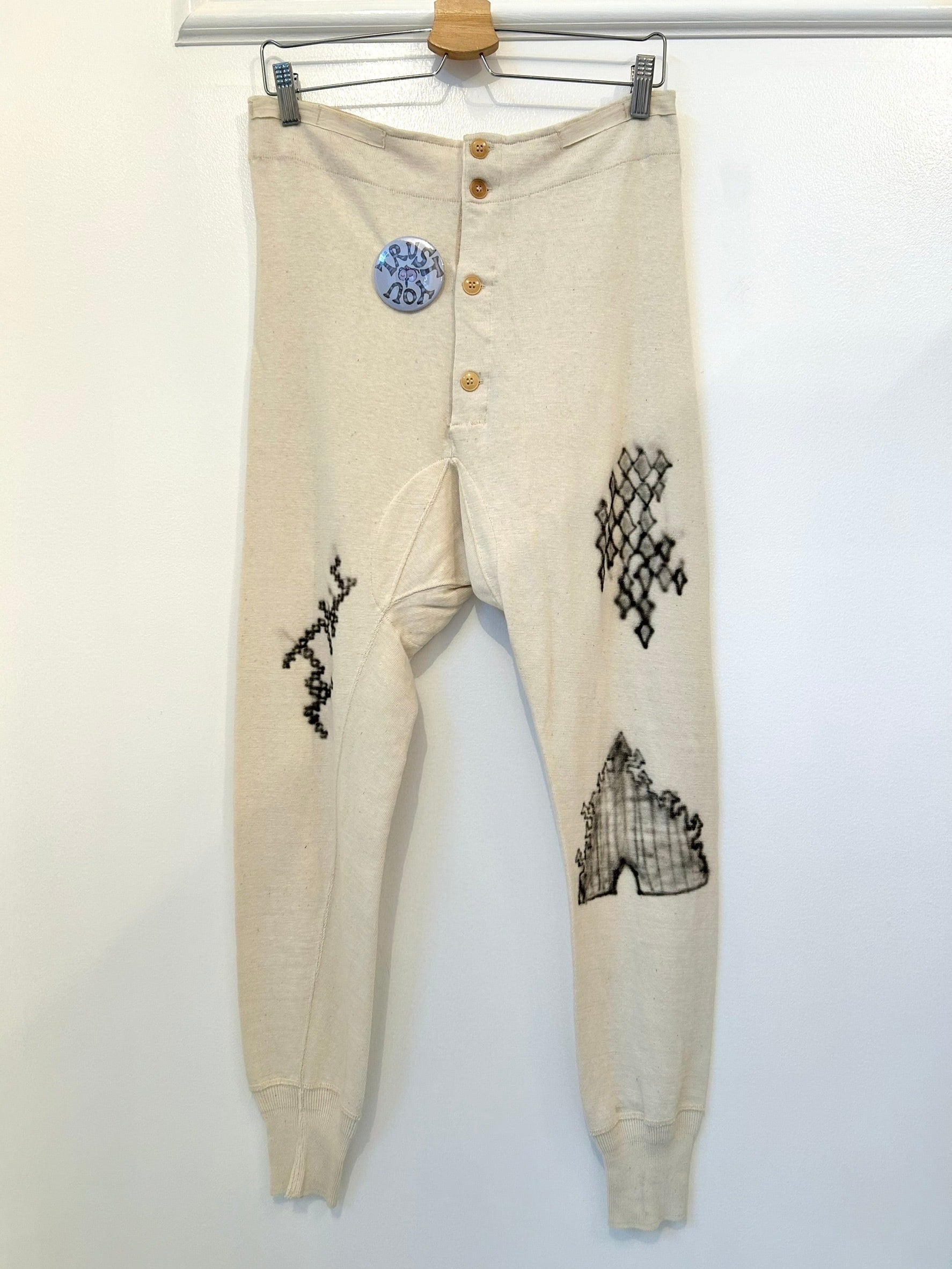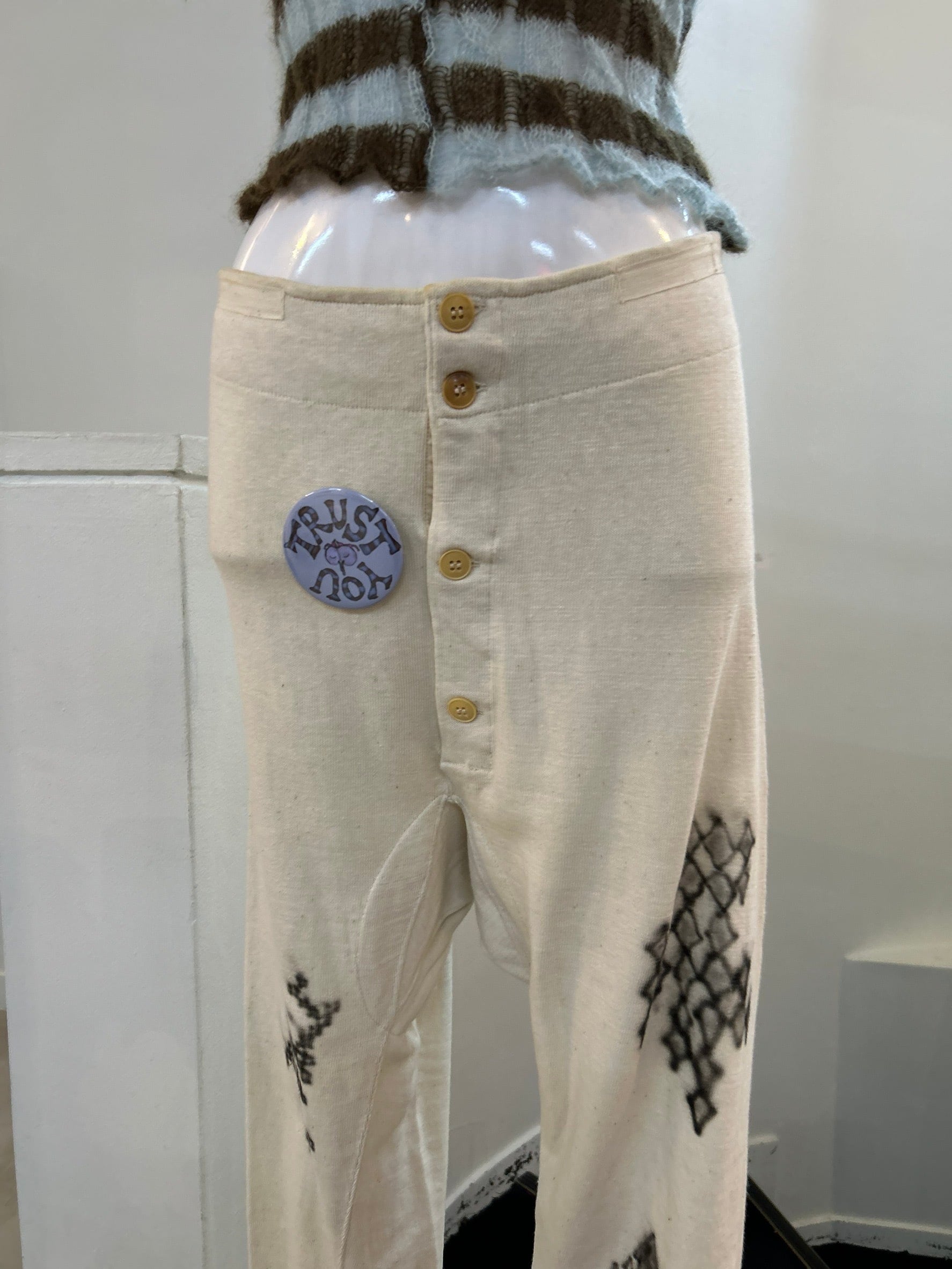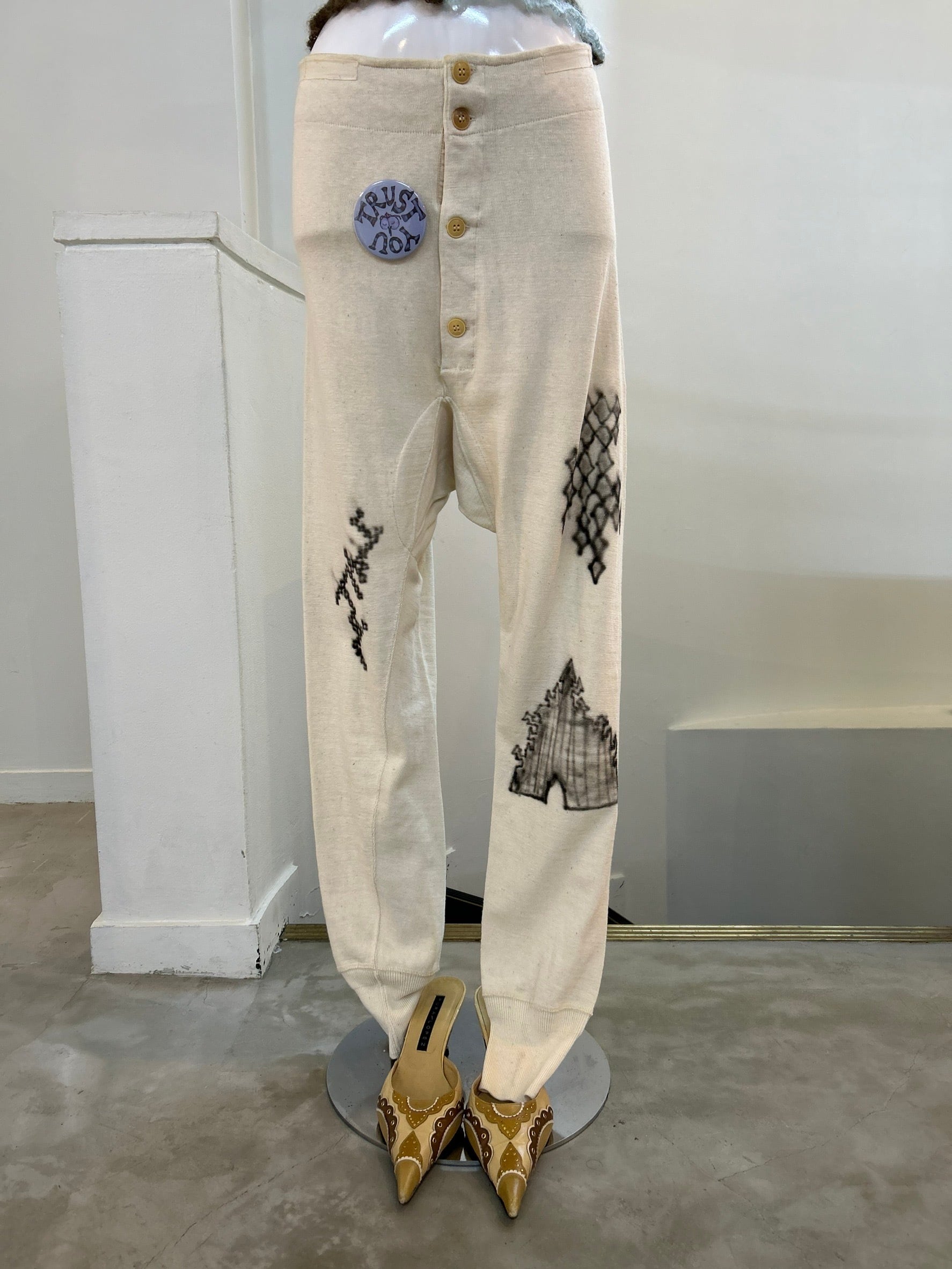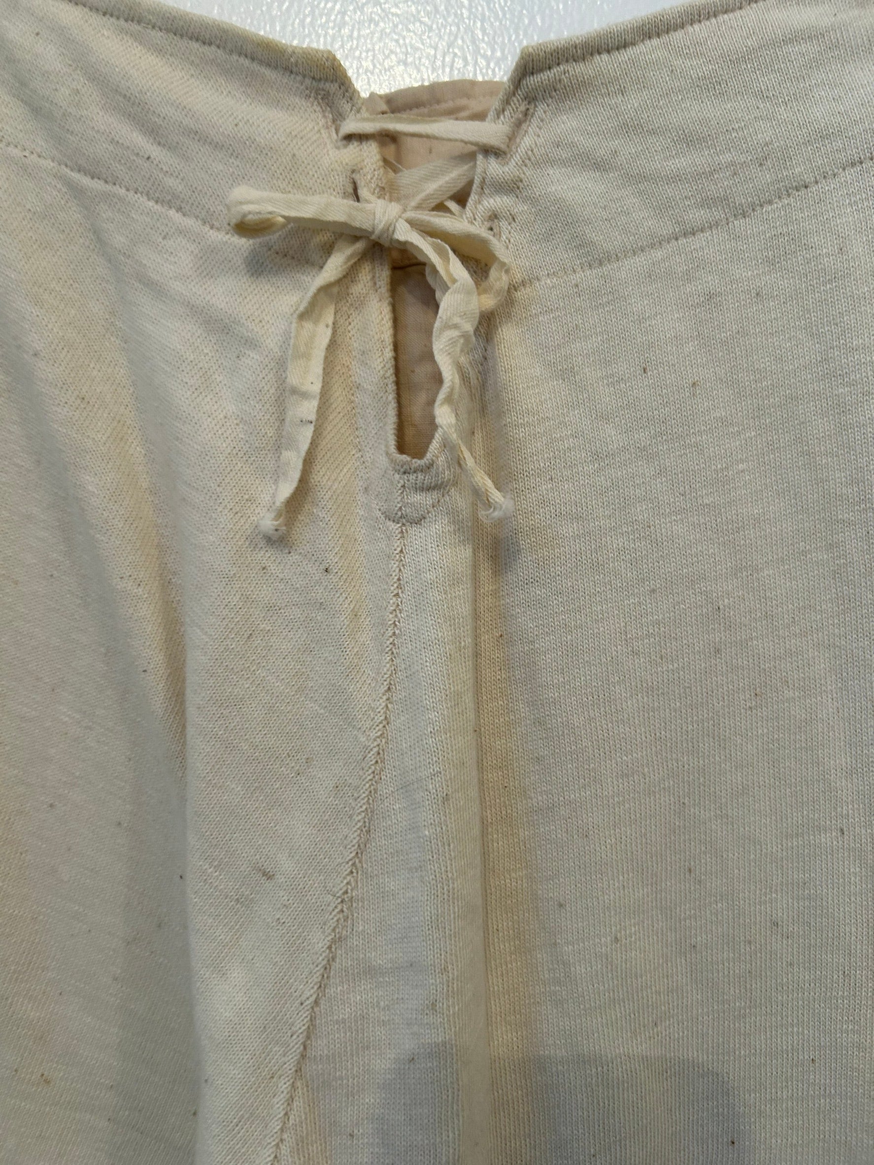 素材: Cotton(表記なし) サイズ: ウエスト幅〜40.5cm(後ろの紐で5cmほど調整可能) ヒップ幅47cm 股上45cm 股下74cm ワタリ幅25cm 裾幅11cm ダメージ: 写真20枚目の汚れがあります