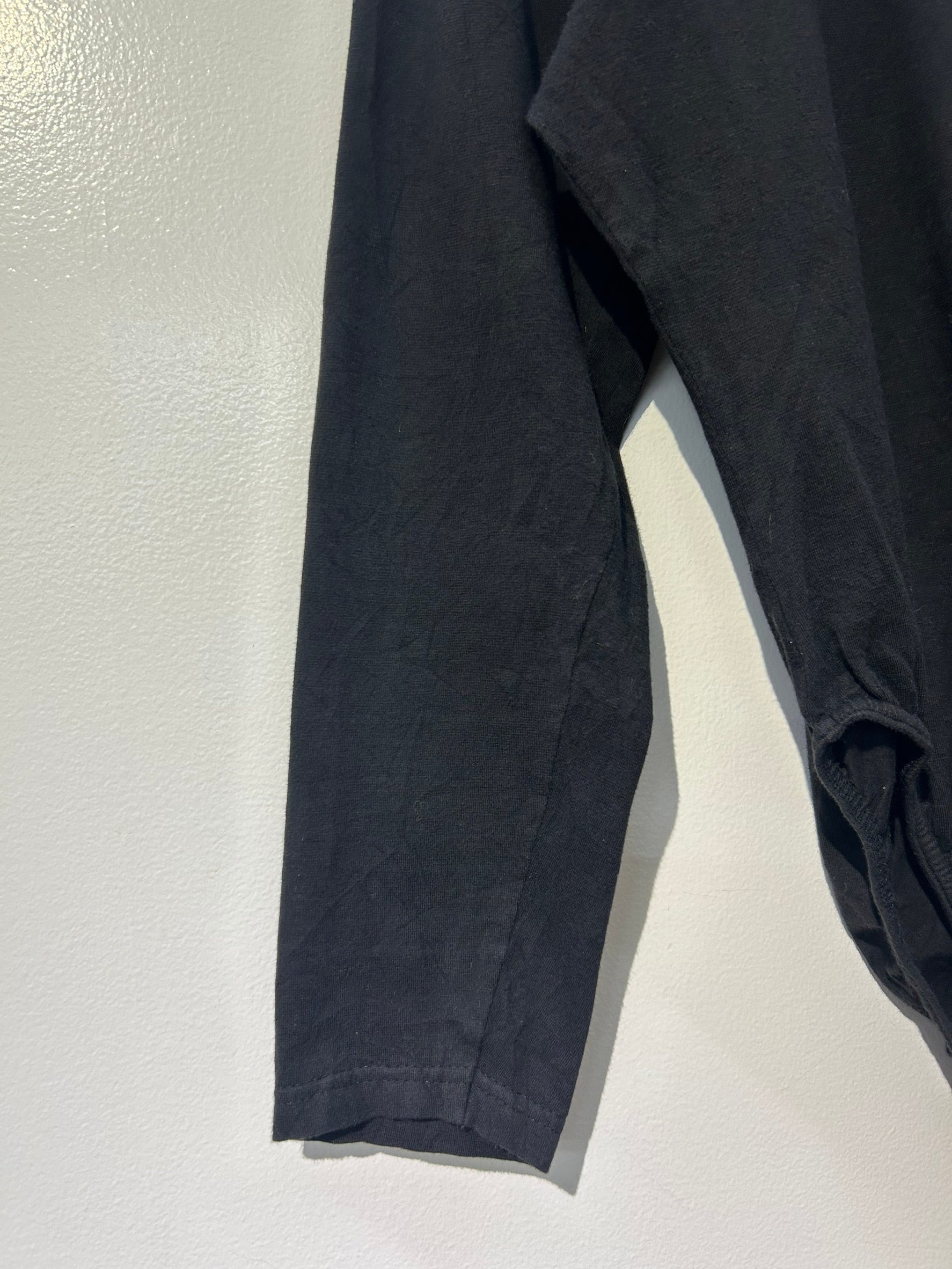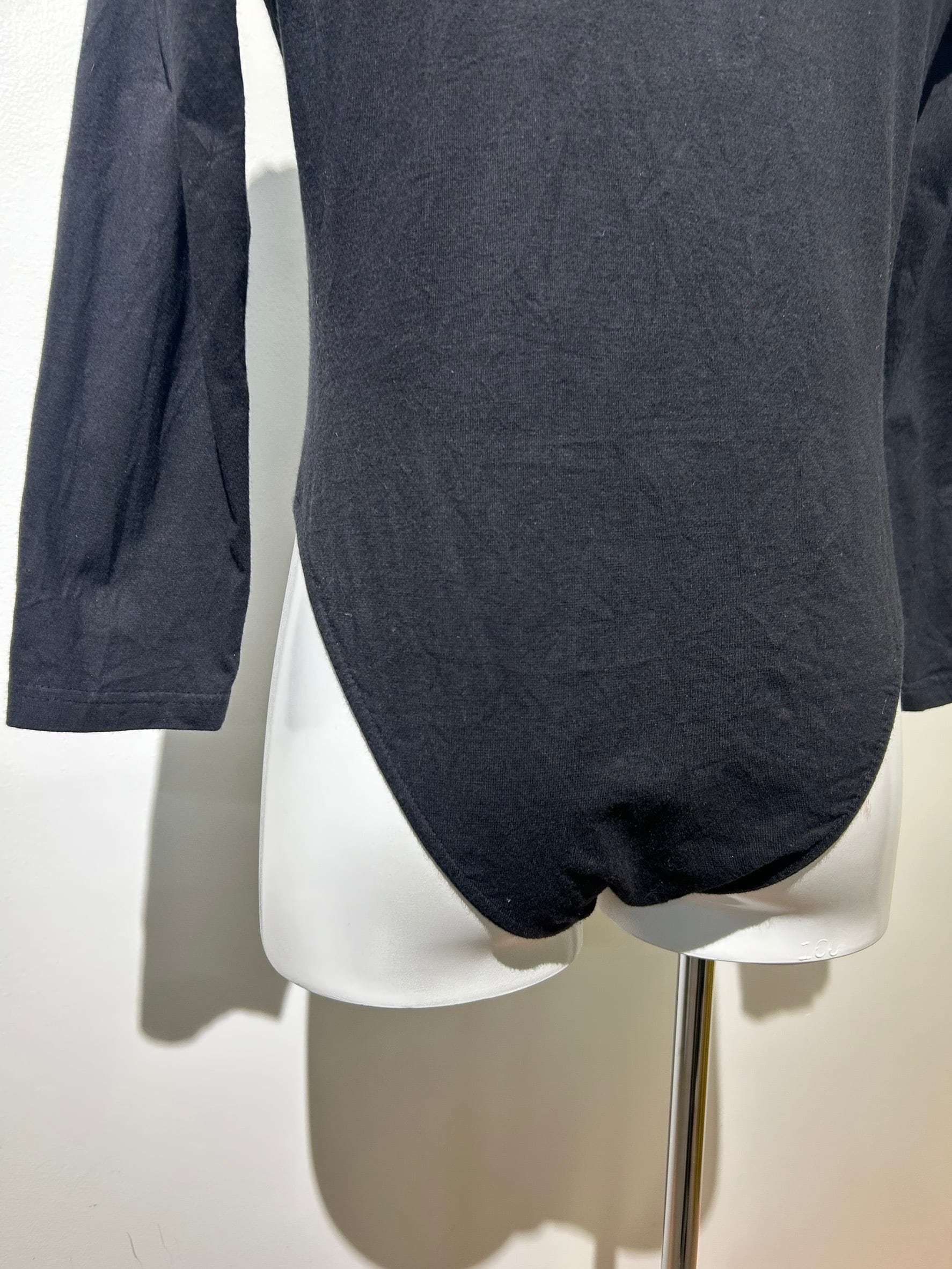 素材: 95%Cotton 5%Elastan サイズ: L(表記) 着丈60cm 肩幅39cm 身幅40cm 袖丈49cm ダメージ: 写真10.11枚目のような取りきれないシワがあります。12.13枚目の汚れがあります。