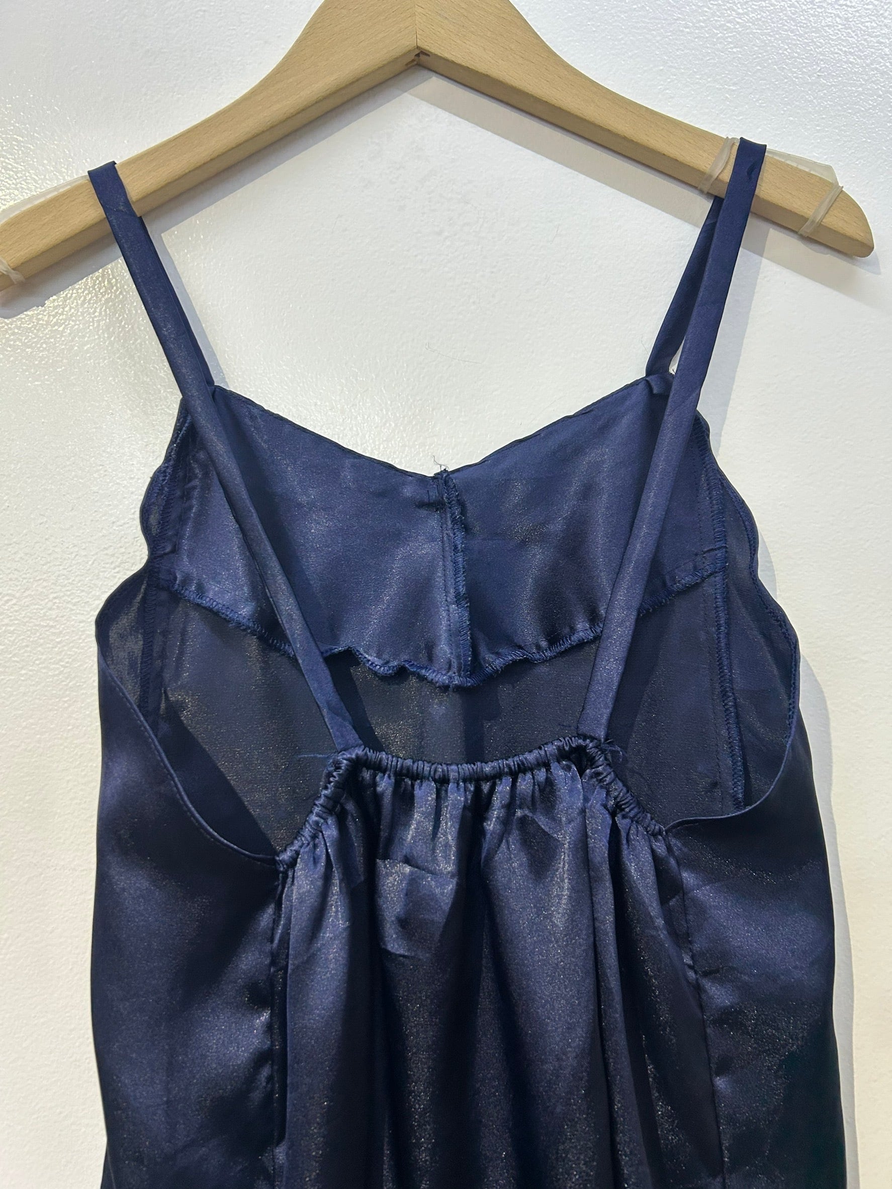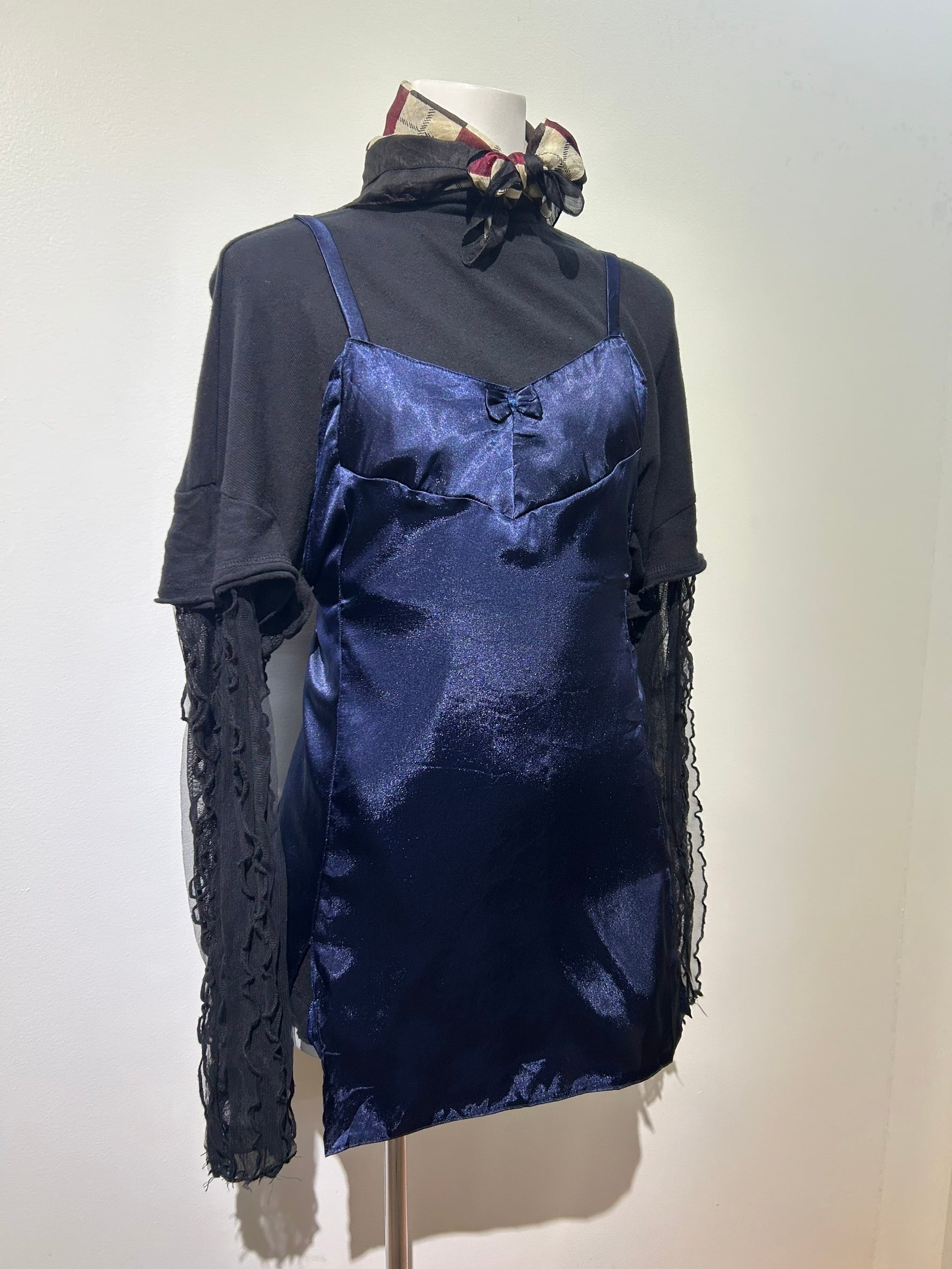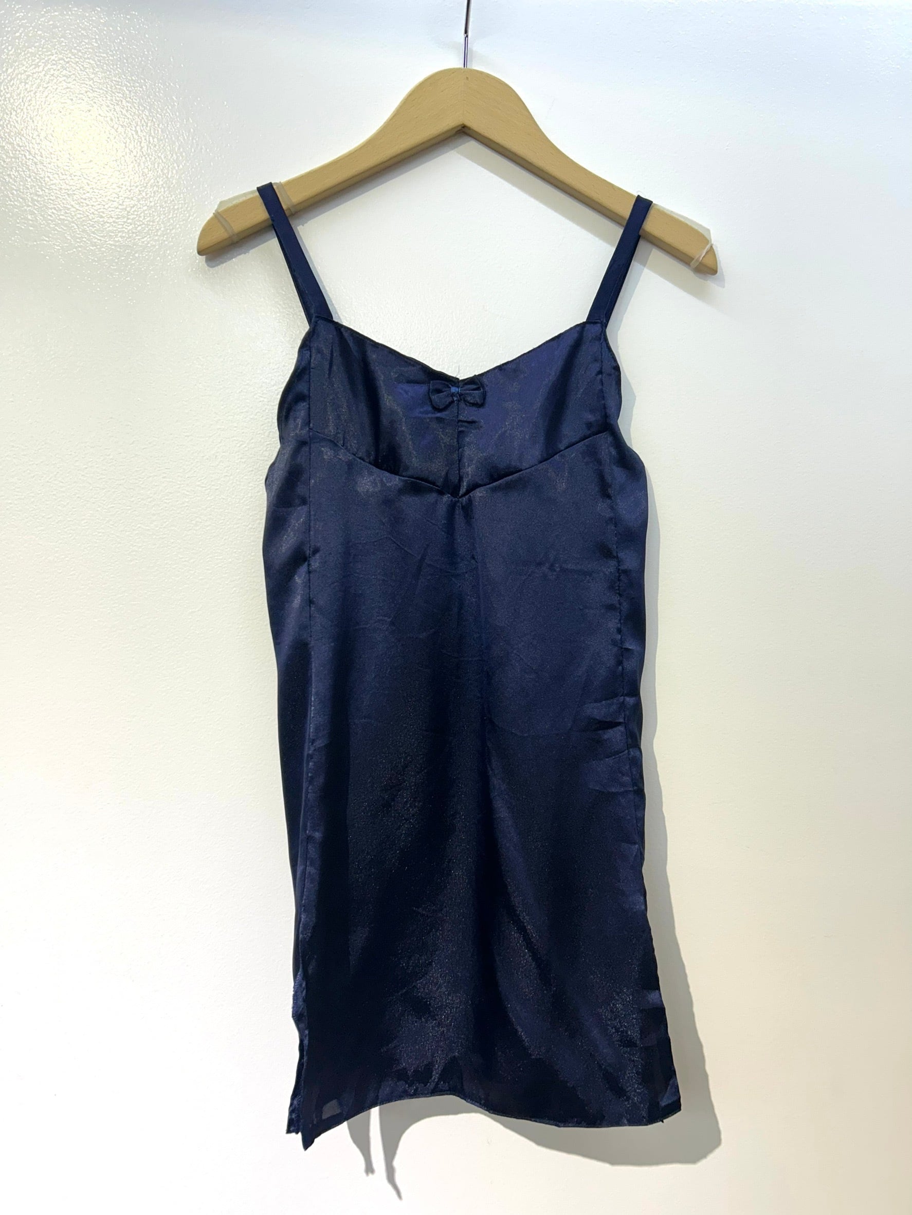 素材: Polyester(表記なし) サイズ: 総丈69cm 身幅39cm 肩紐38cm 写真13〜15枚目の生地のダメージがあります。 両側にスリットが入っています。スリットの深さは写真12枚目をご確認ください。