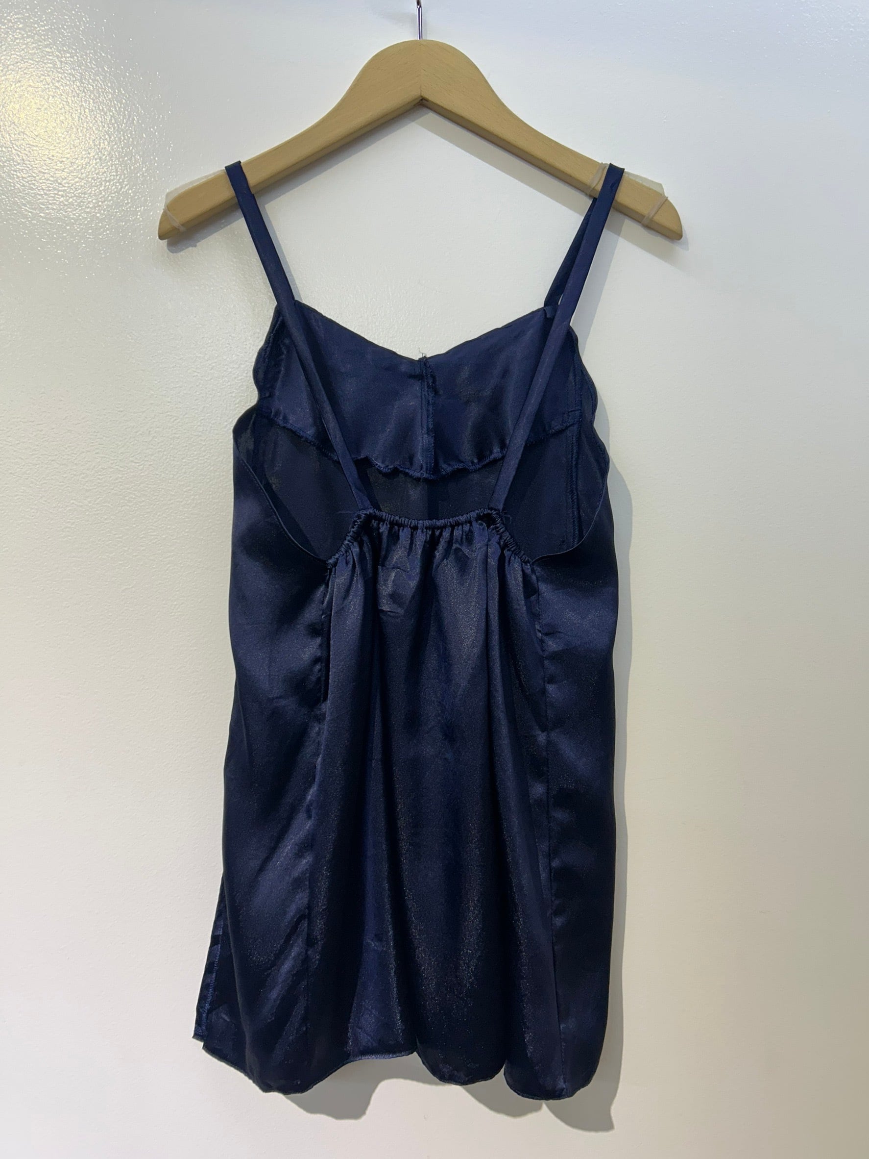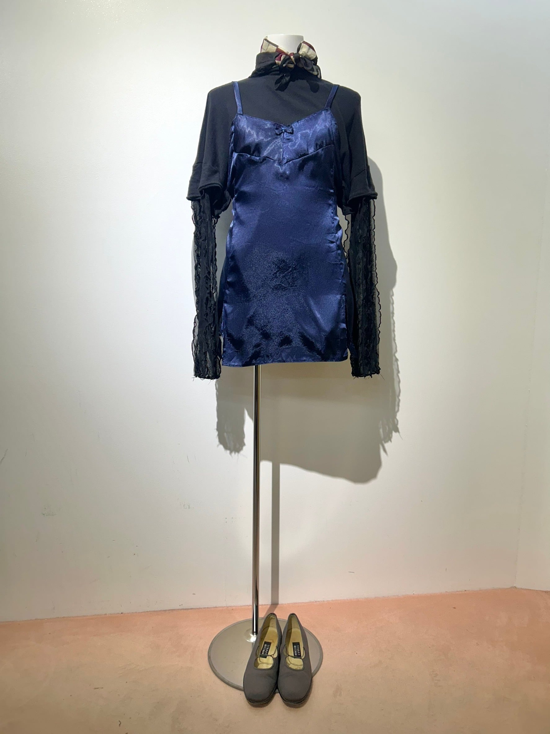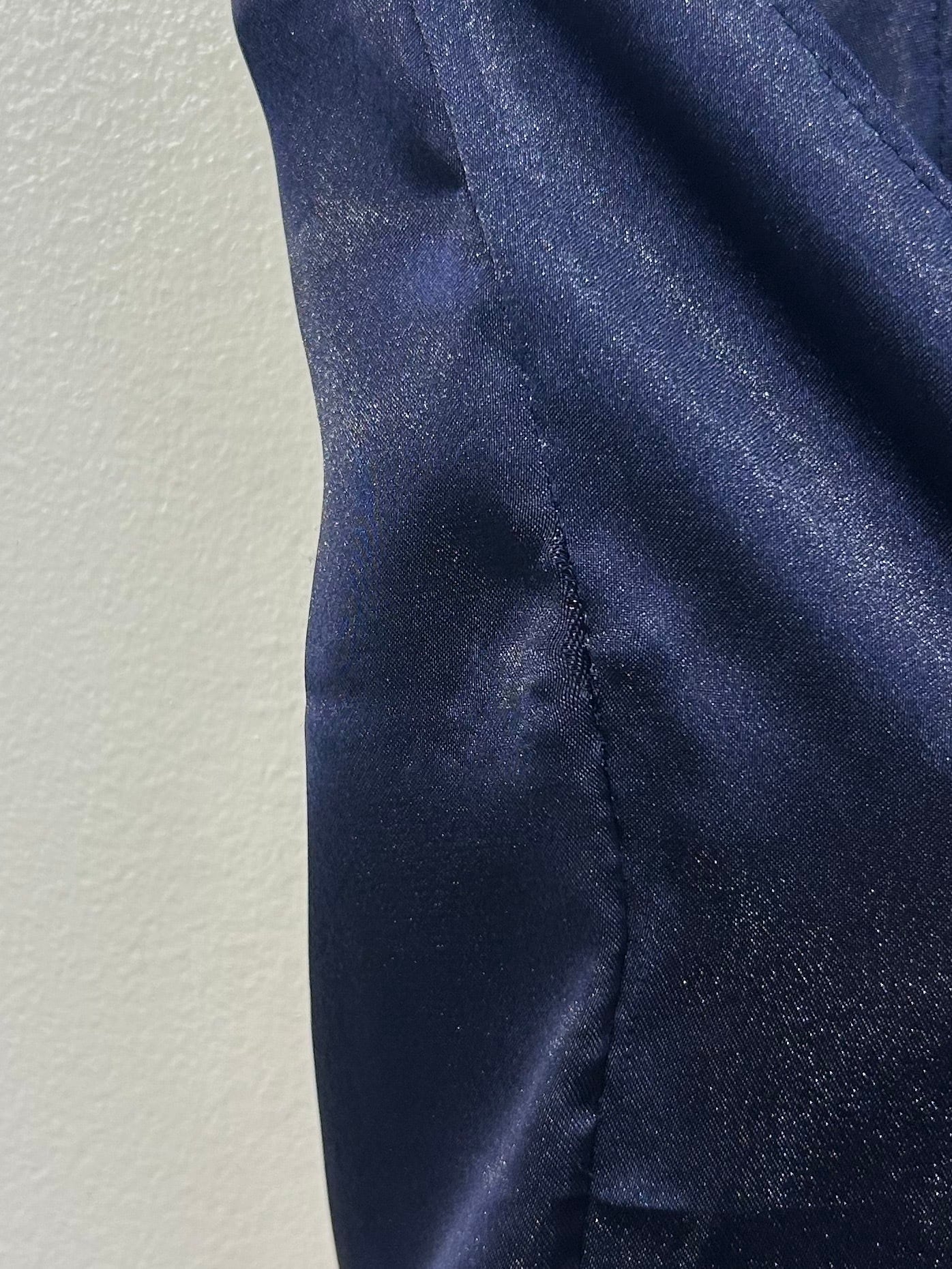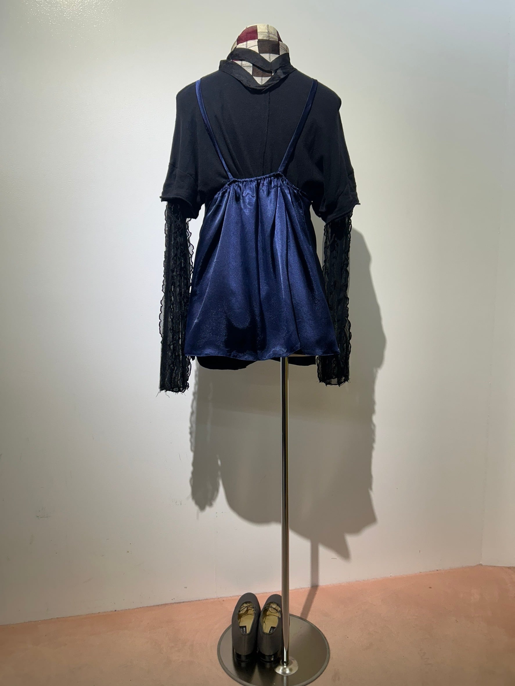 素材: Polyester(表記なし) サイズ: 総丈69cm 身幅39cm 肩紐38cm 写真13〜15枚目の生地のダメージがあります。 両側にスリットが入っています。スリットの深さは写真12枚目をご確認ください。
