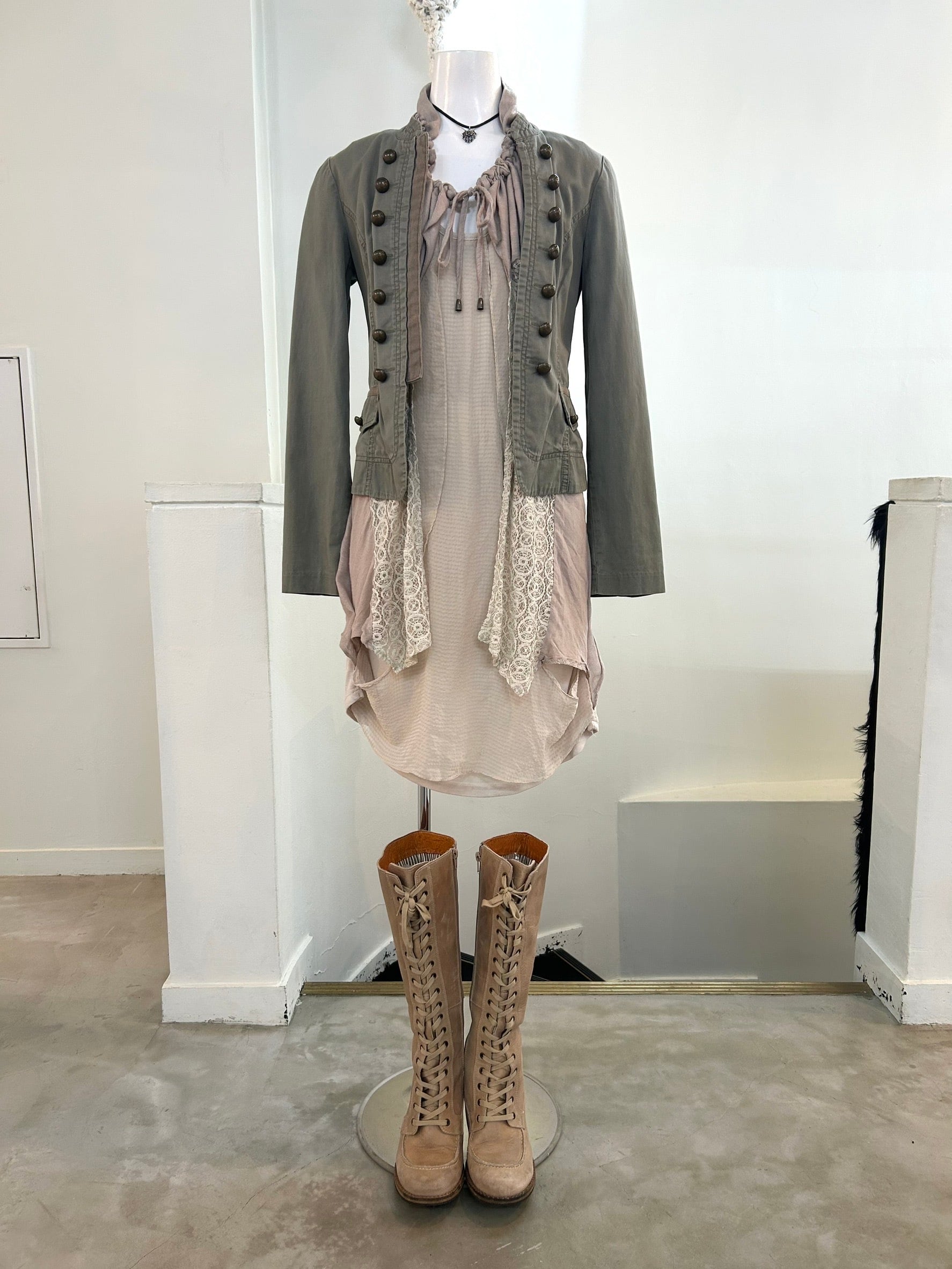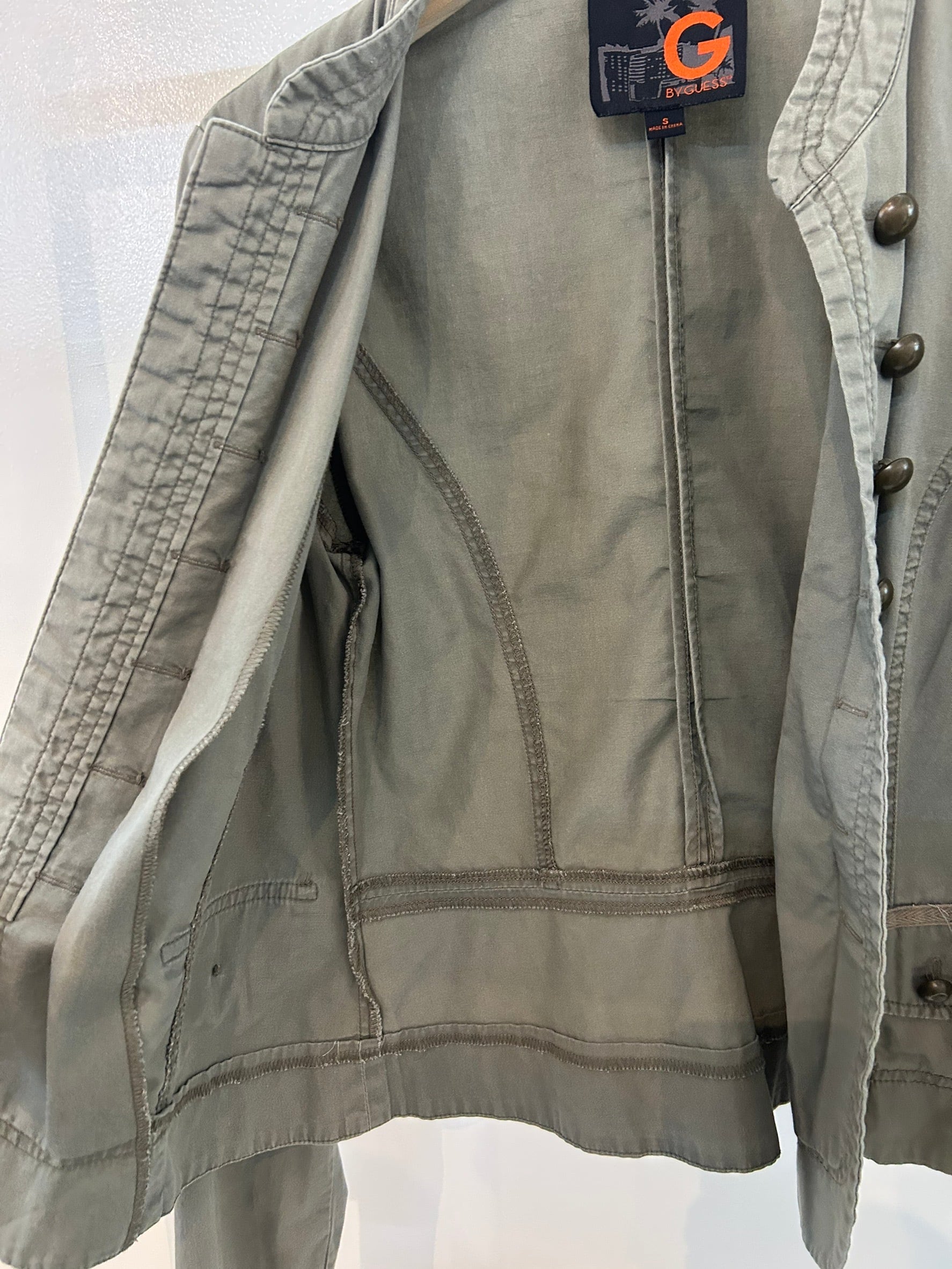 素材: 100%Cotton サイズ: S(表記) 着丈50cm 肩幅38cm 身幅41cm 袖丈60cm ダメージ: 写真14枚目の汚れがあります ※ボタンやファスナーはなく常に前開きタイプのジャケットです。