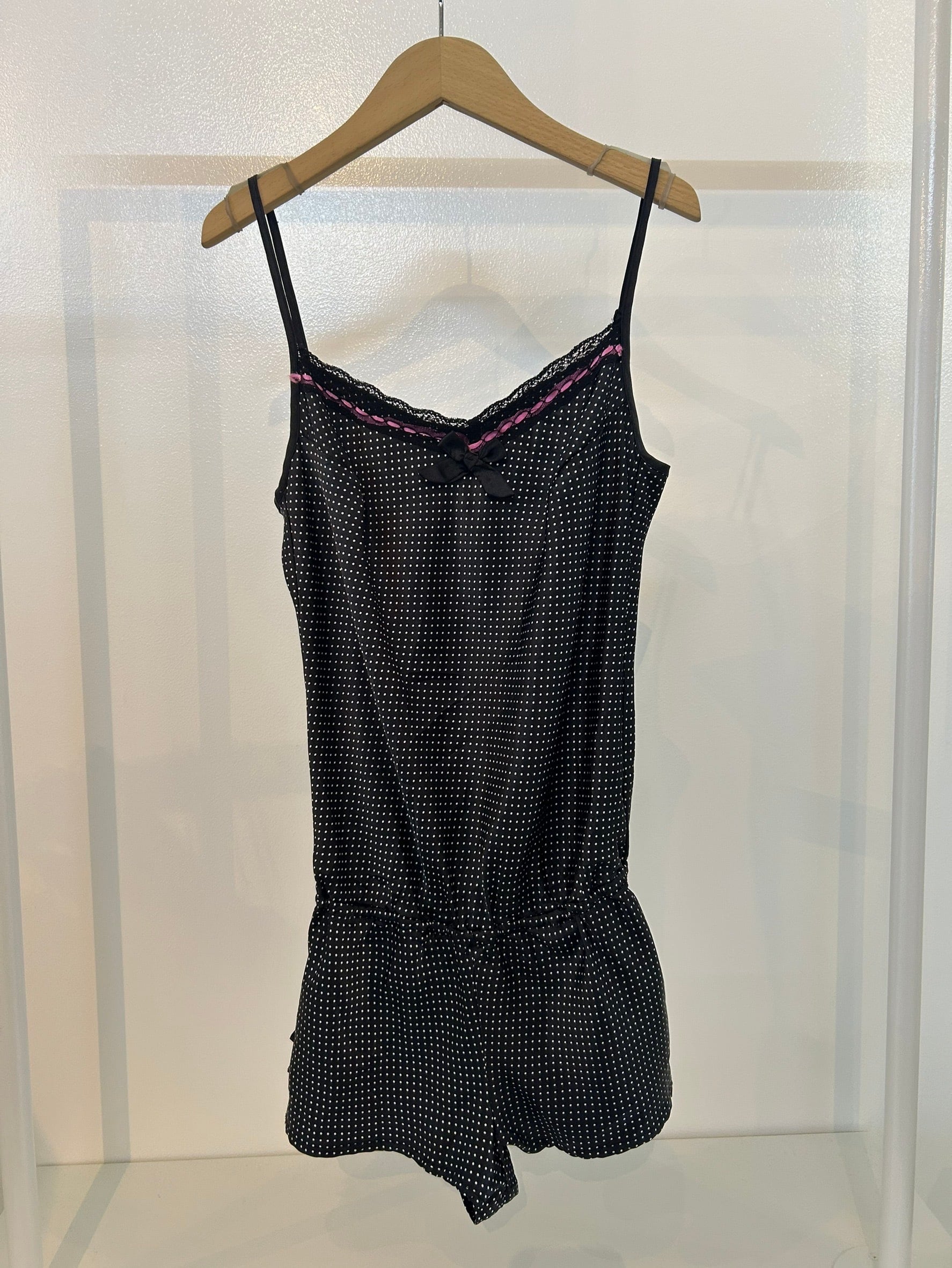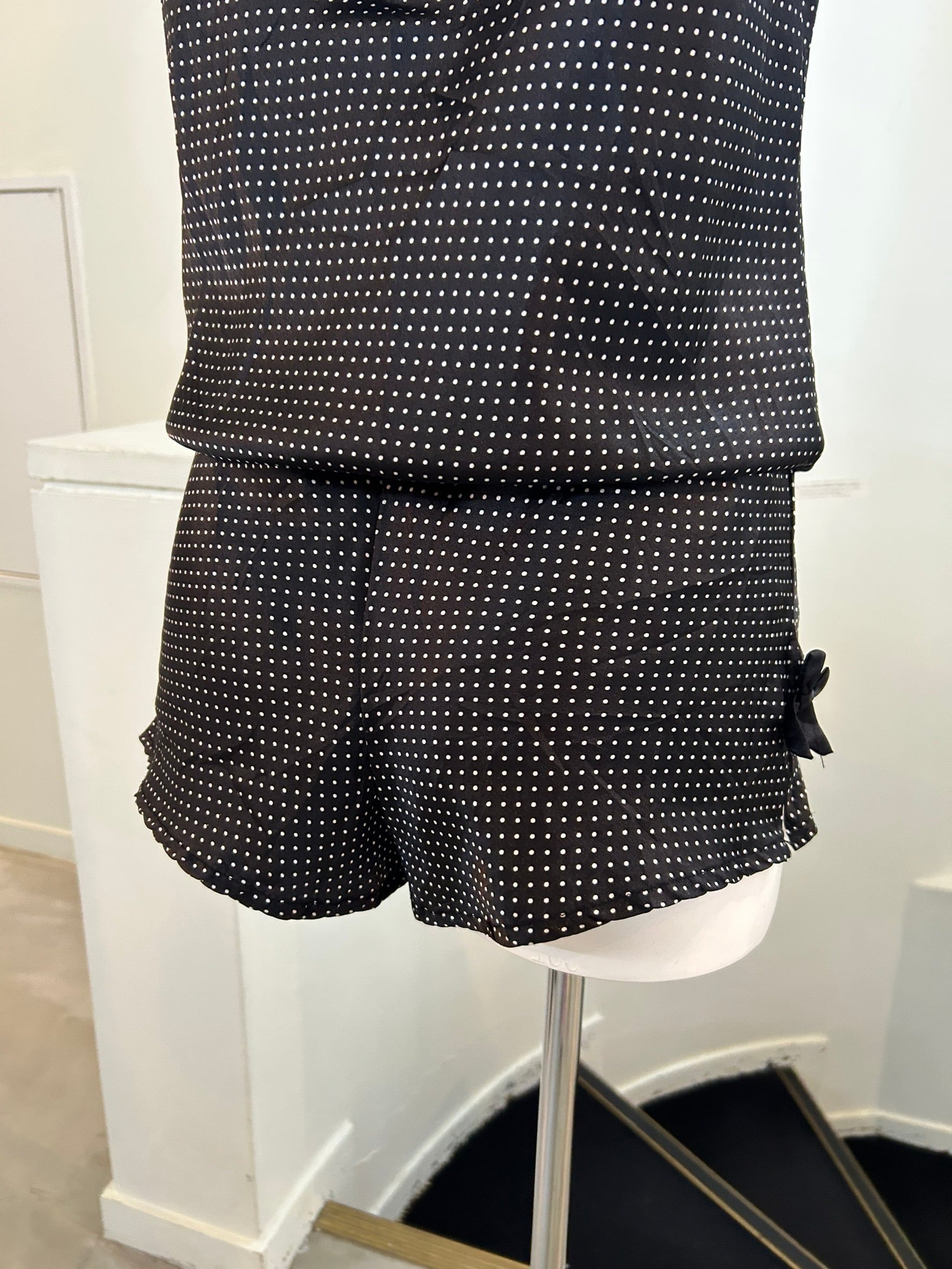 素材: 100%Cotton サイズ: S(表記) 総丈69〜78cm 身幅44cm ウエスト幅32〜46cm(ゴム) 股上22cm 股下3.5cm 裾幅32cm ダメージ: 片方のリボンがありません。写真12.13枚目をご確認ください。