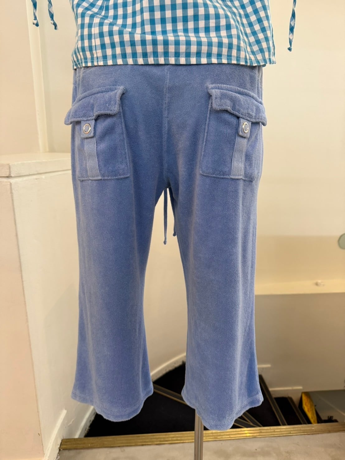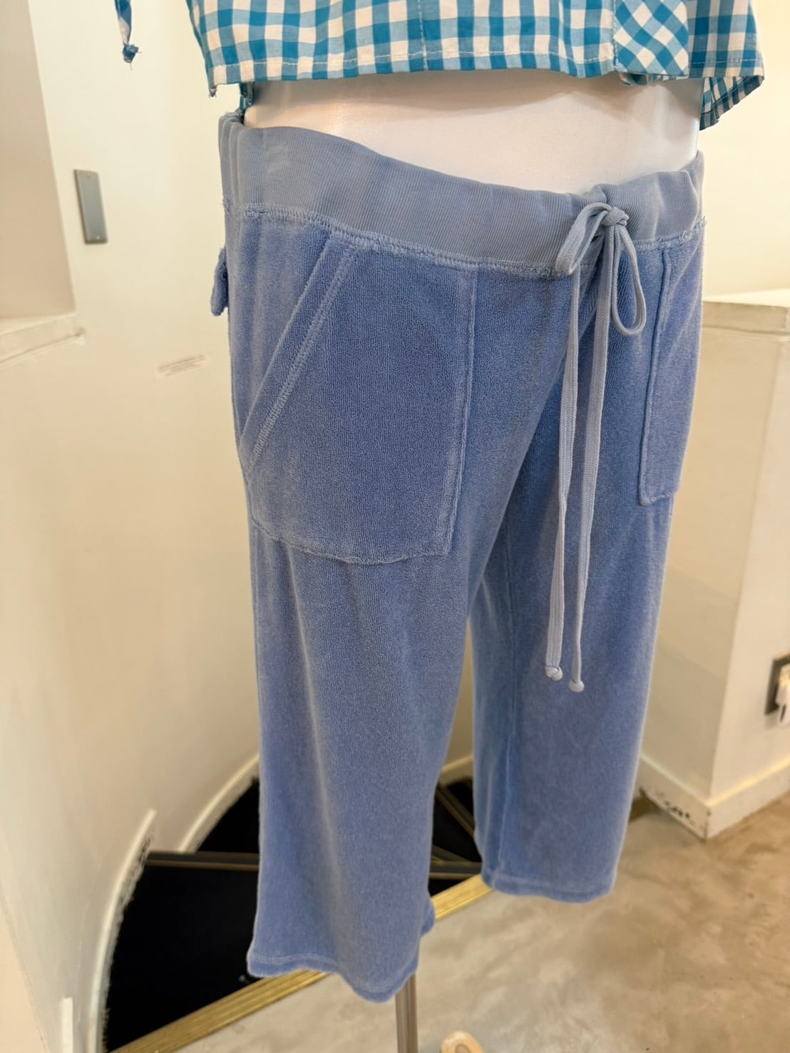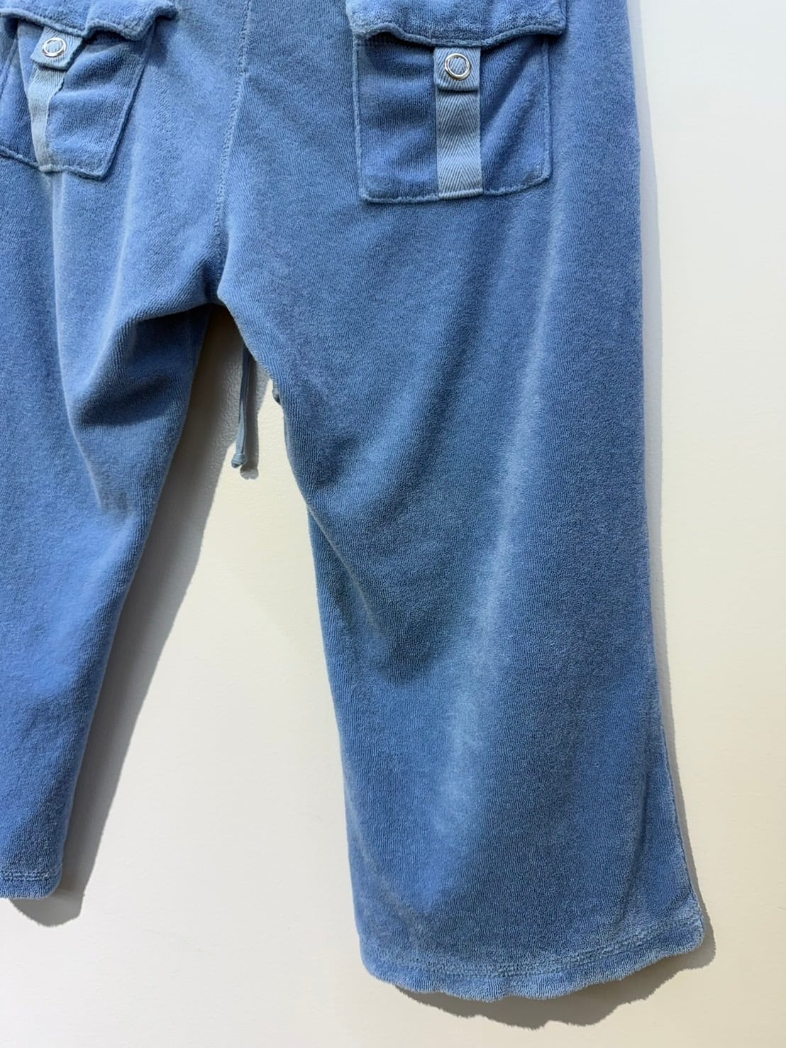 素材: Polyester(表記なし) サイズ: S(表記) ウエスト幅46cm 股上18cm 股下41cm わたり幅25cm 裾幅22cm ダメージ: 写真14,15枚目のような糸のほつれがあります。